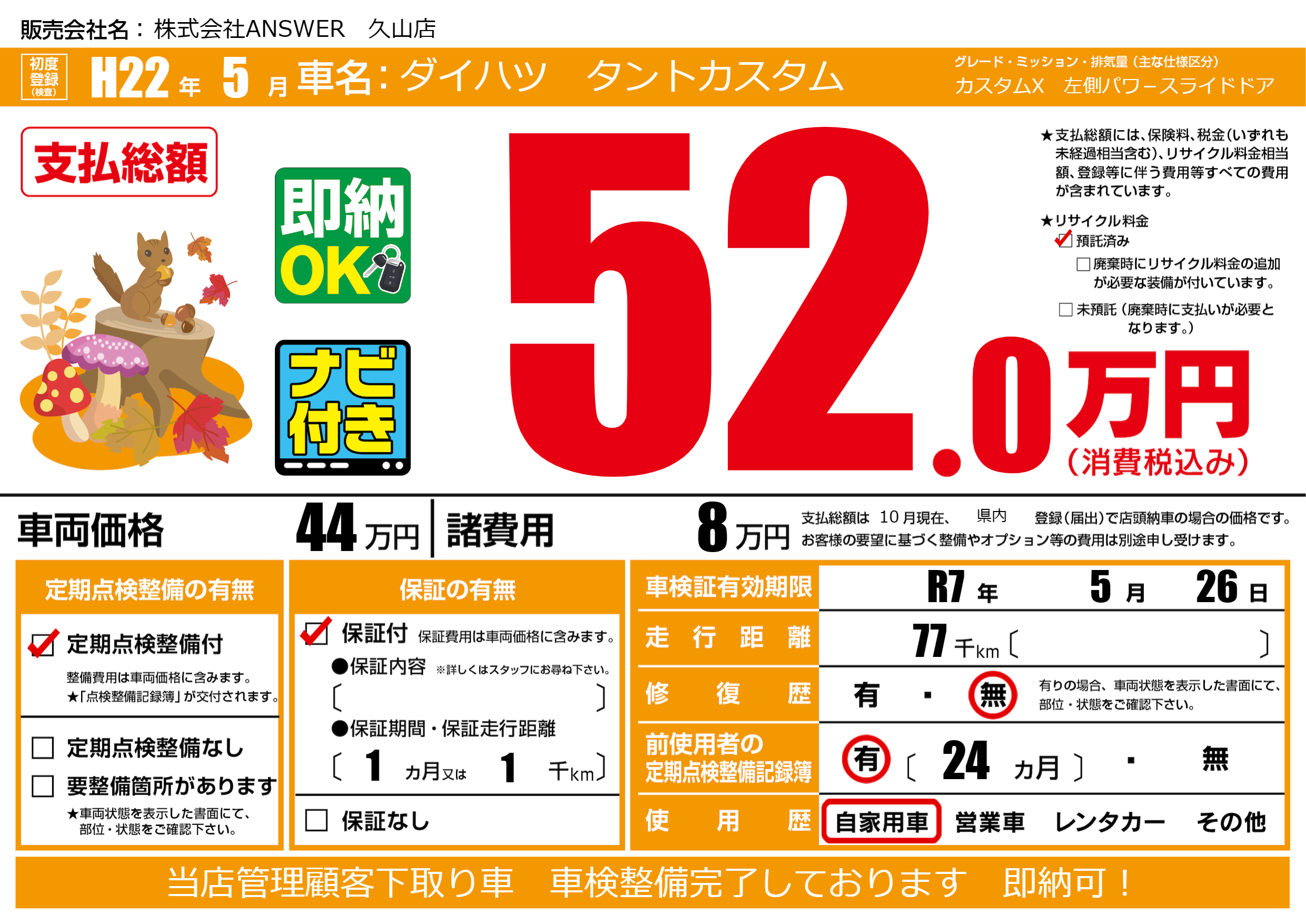 なし | 車検制限 | R7年5月26月 |