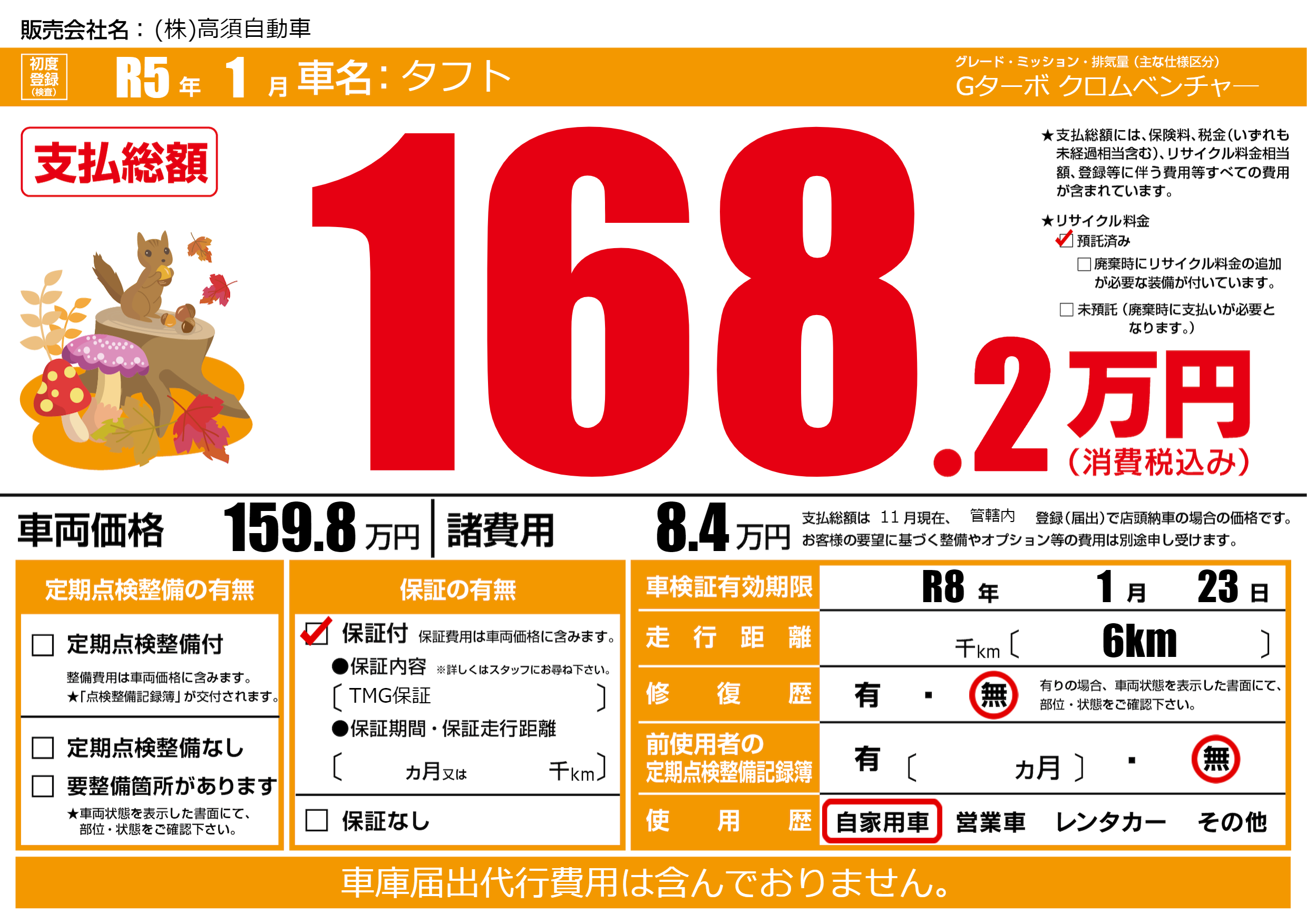 保証付き 保証内容(TMG保証) ---ヶ月または()千kmまで |