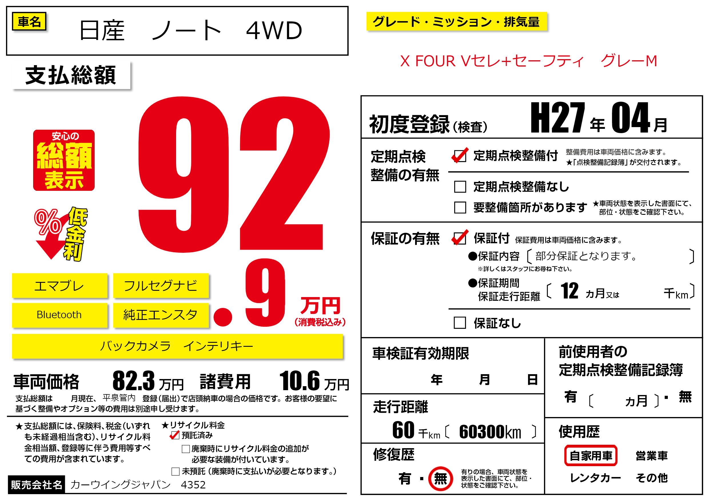 | 車名 | 日産 ノート 4WD | グレード ミッション 排気量 |