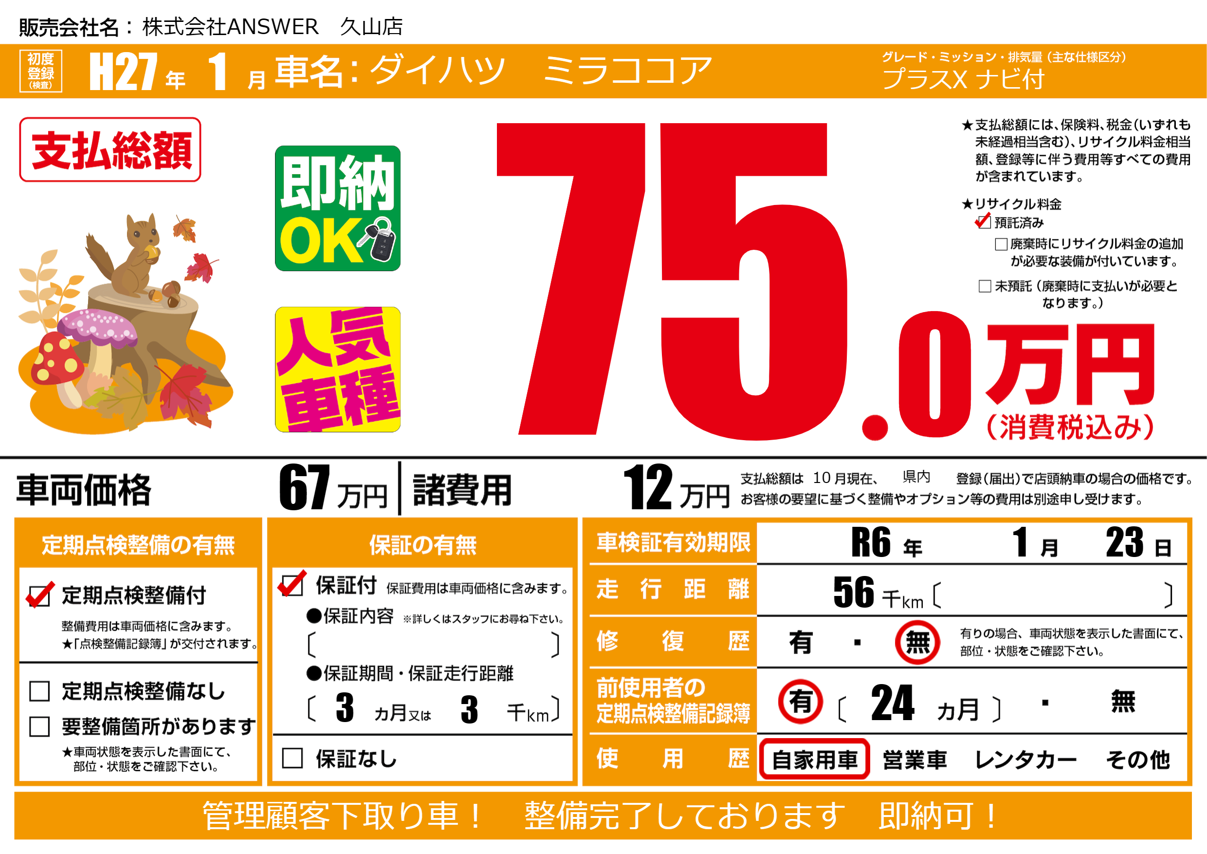 | 走行キロ | 5.6万km | 初年度登録 | H27年1月 |