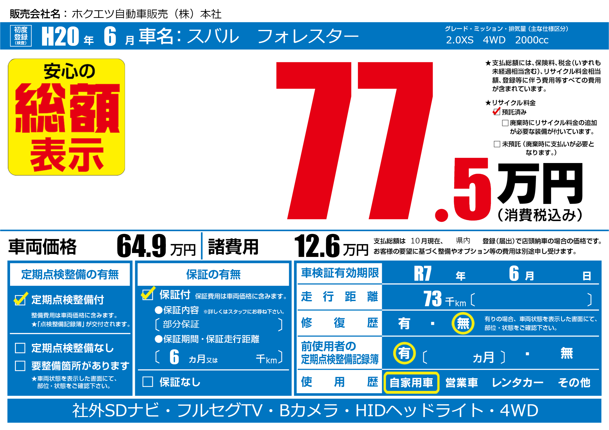 | 車名 | スバル フォレスター | グレード ミッション 排気量 |