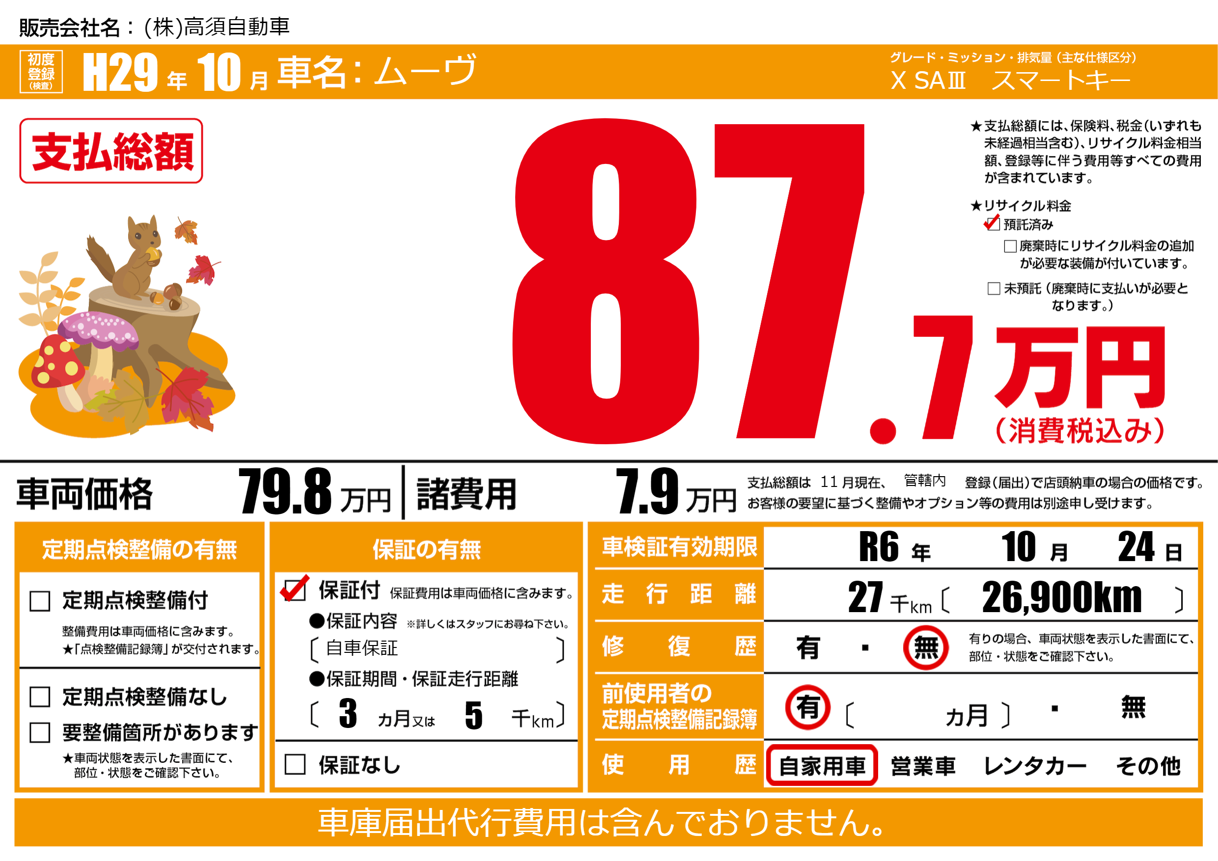 保証付き 保証内容(自車保証) 3ヶ月または(5)千kmまで |
