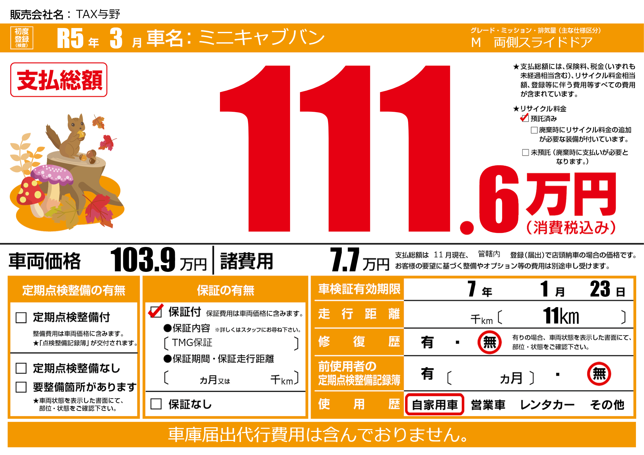 | 走行キロ | - | 初年度登録 | R5年3月 |