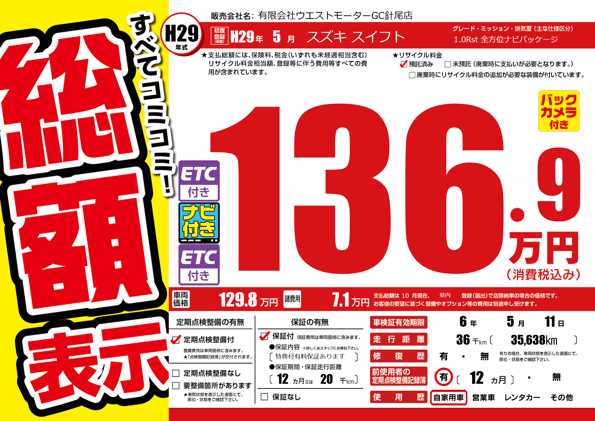 | 走行キロ | 3.6万km | 初年度登録 | H29年5月 |