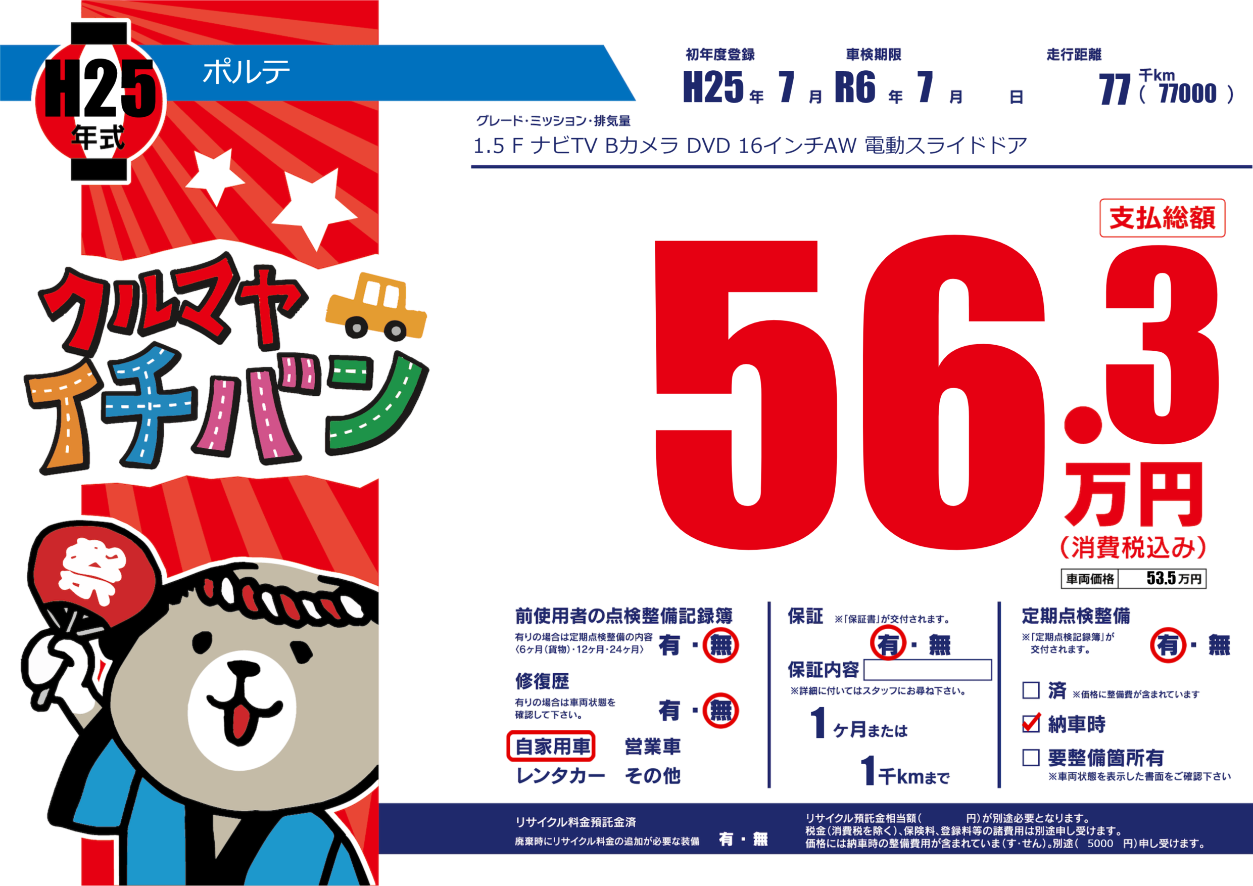 | 走行キロ | 7.7万km | 初年度登録 | H25年7月 |