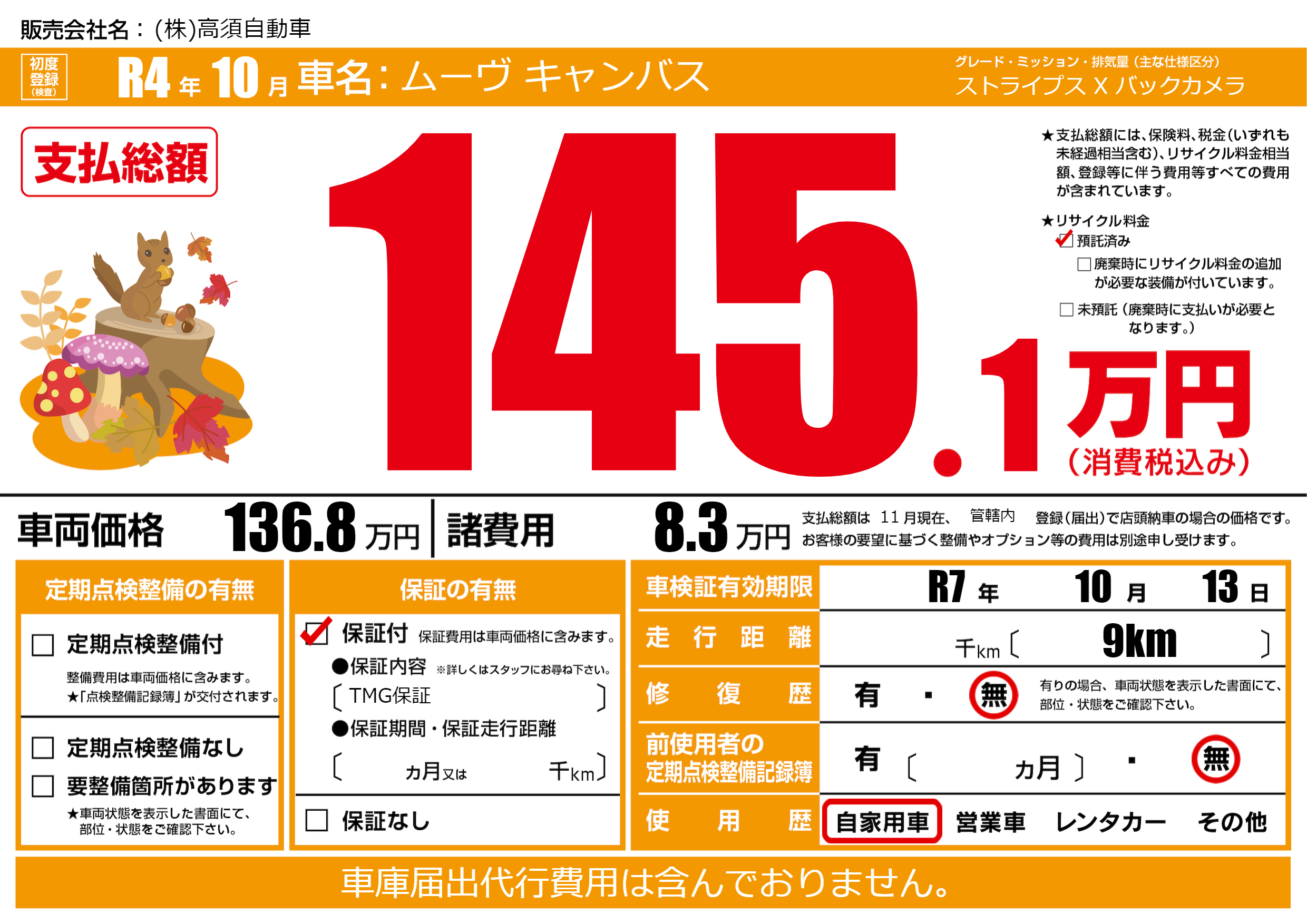 | 車名 | ムーヴ キャンバス | グレード ミッション 排気量 |