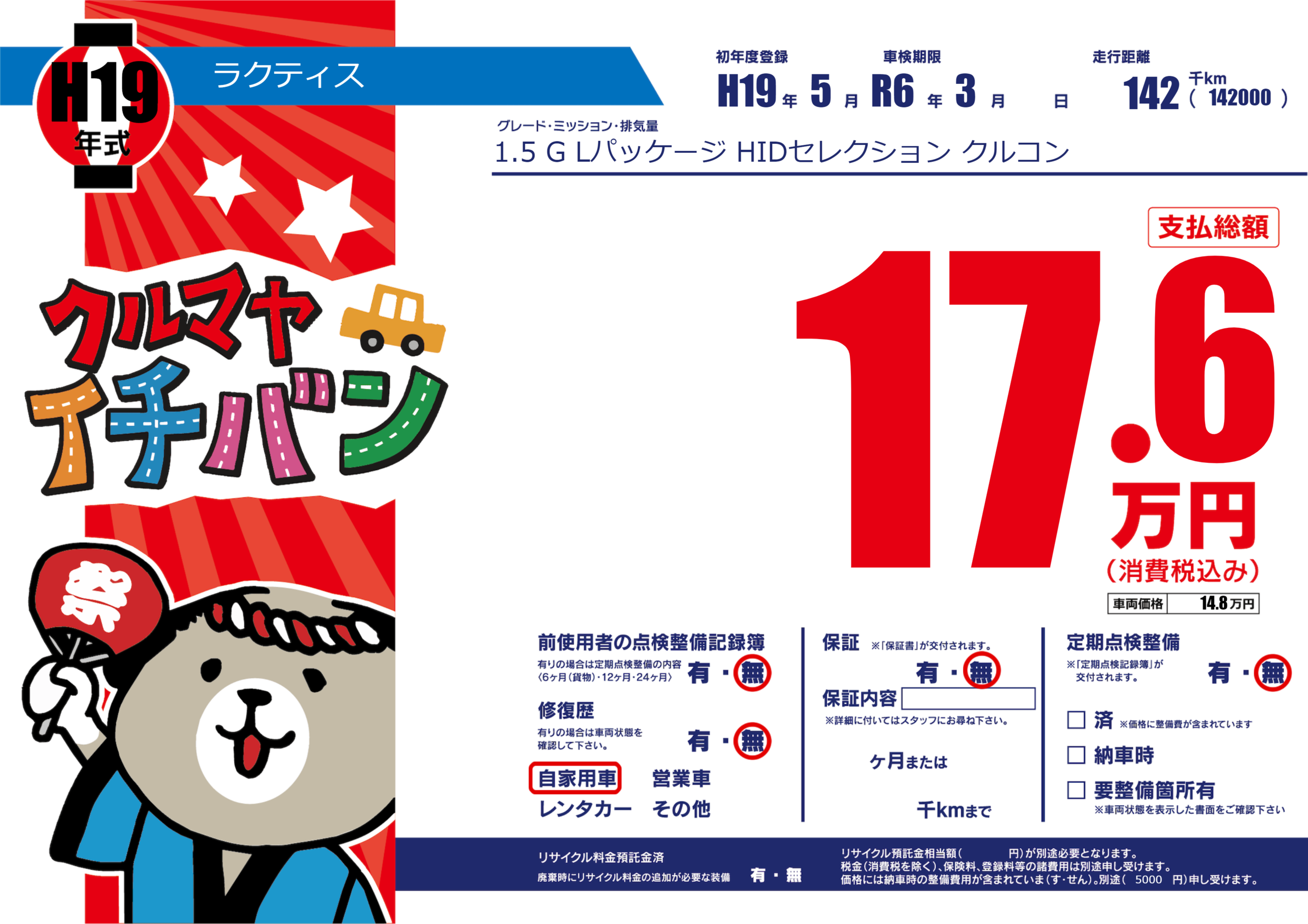 | 走行キロ | 14.2万km | 初年度登録 | H19年5月 |