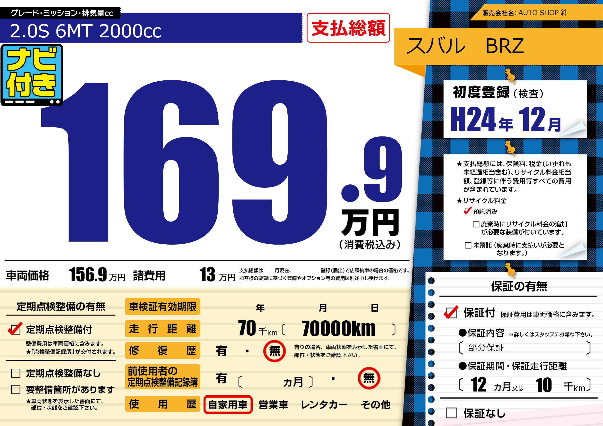 | 車名 | スバル BRZ | グレード ミッション 排気量 |