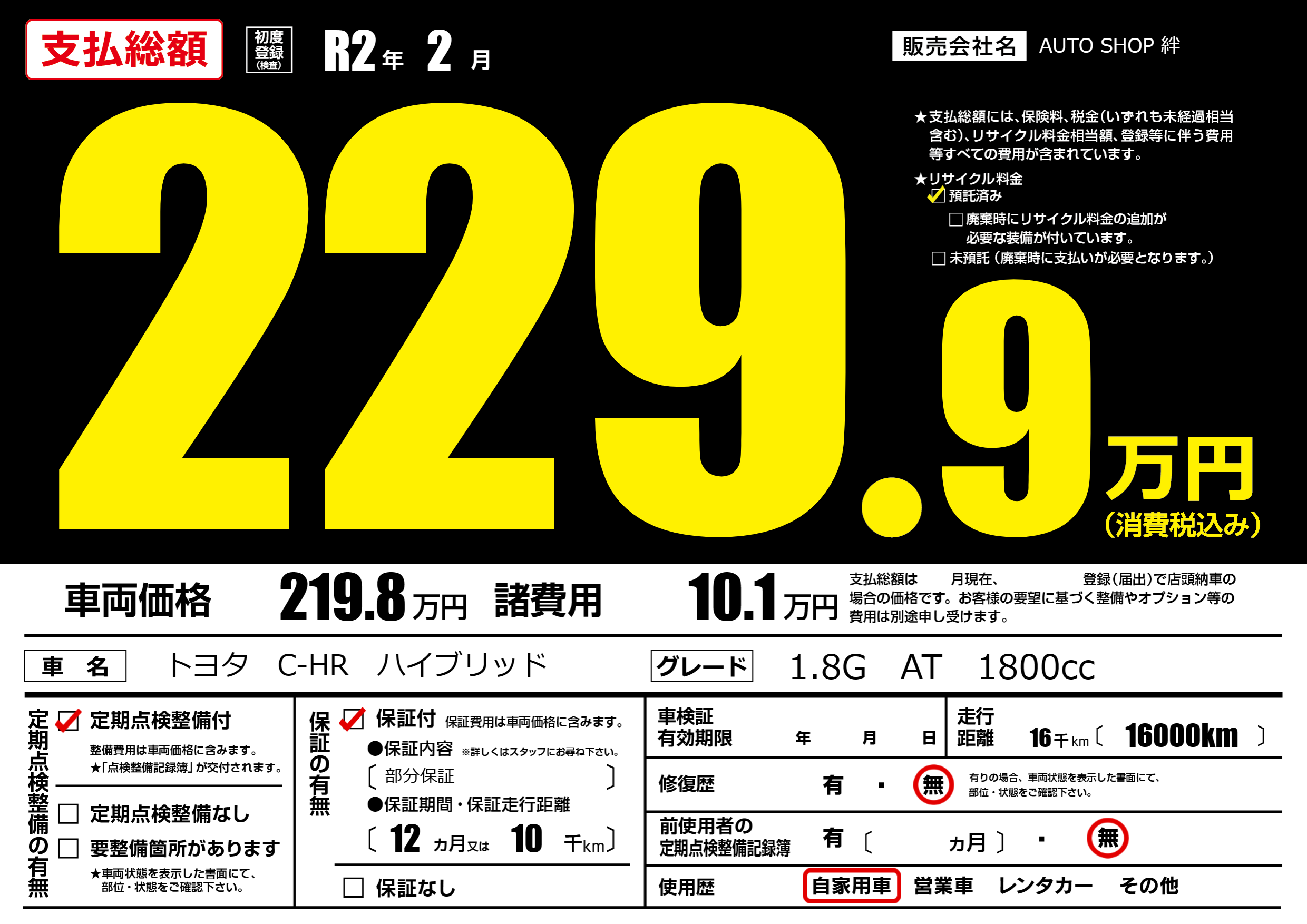 | 車検制限 | - 年 - 月 - 日 | ||