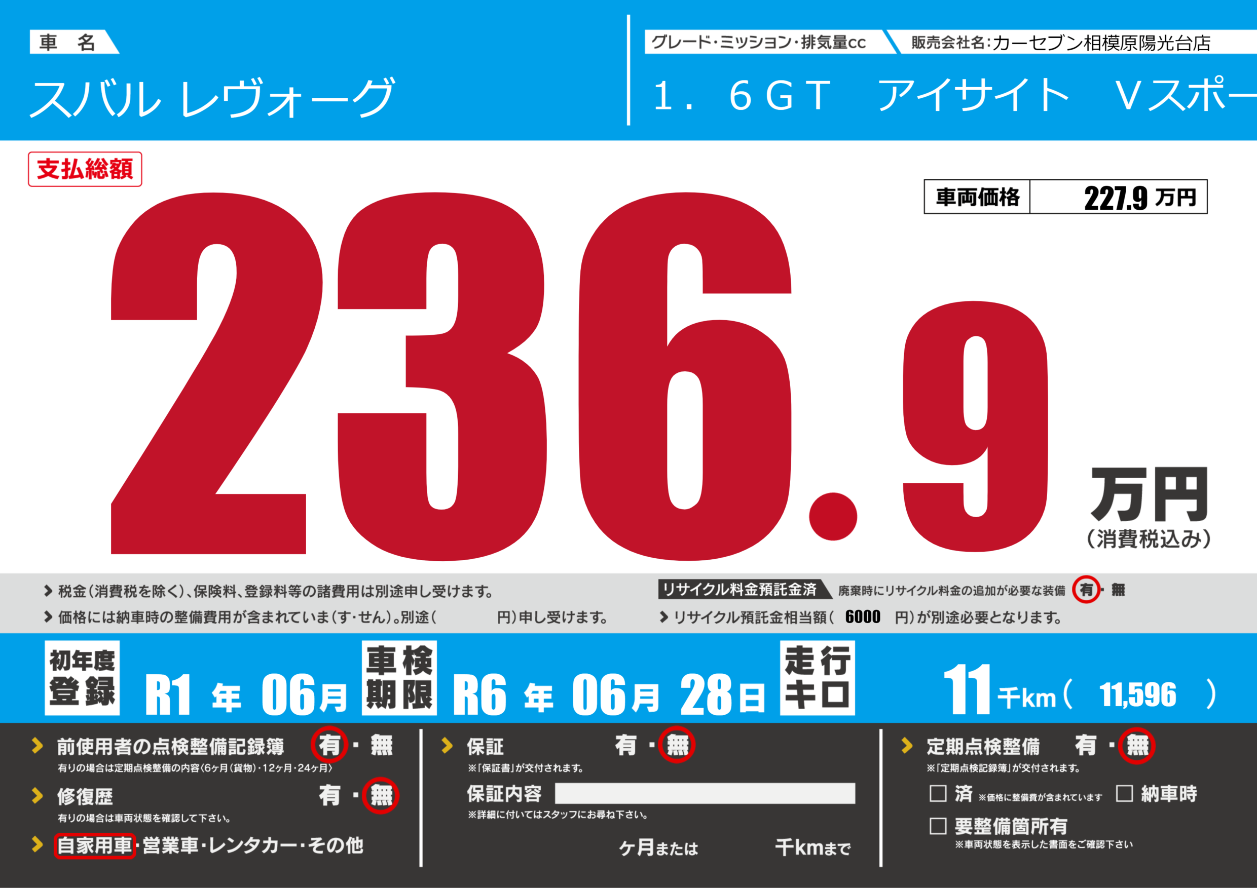 | 車名 | スバル レヴォーグ | グレード ミッション 排気量 |