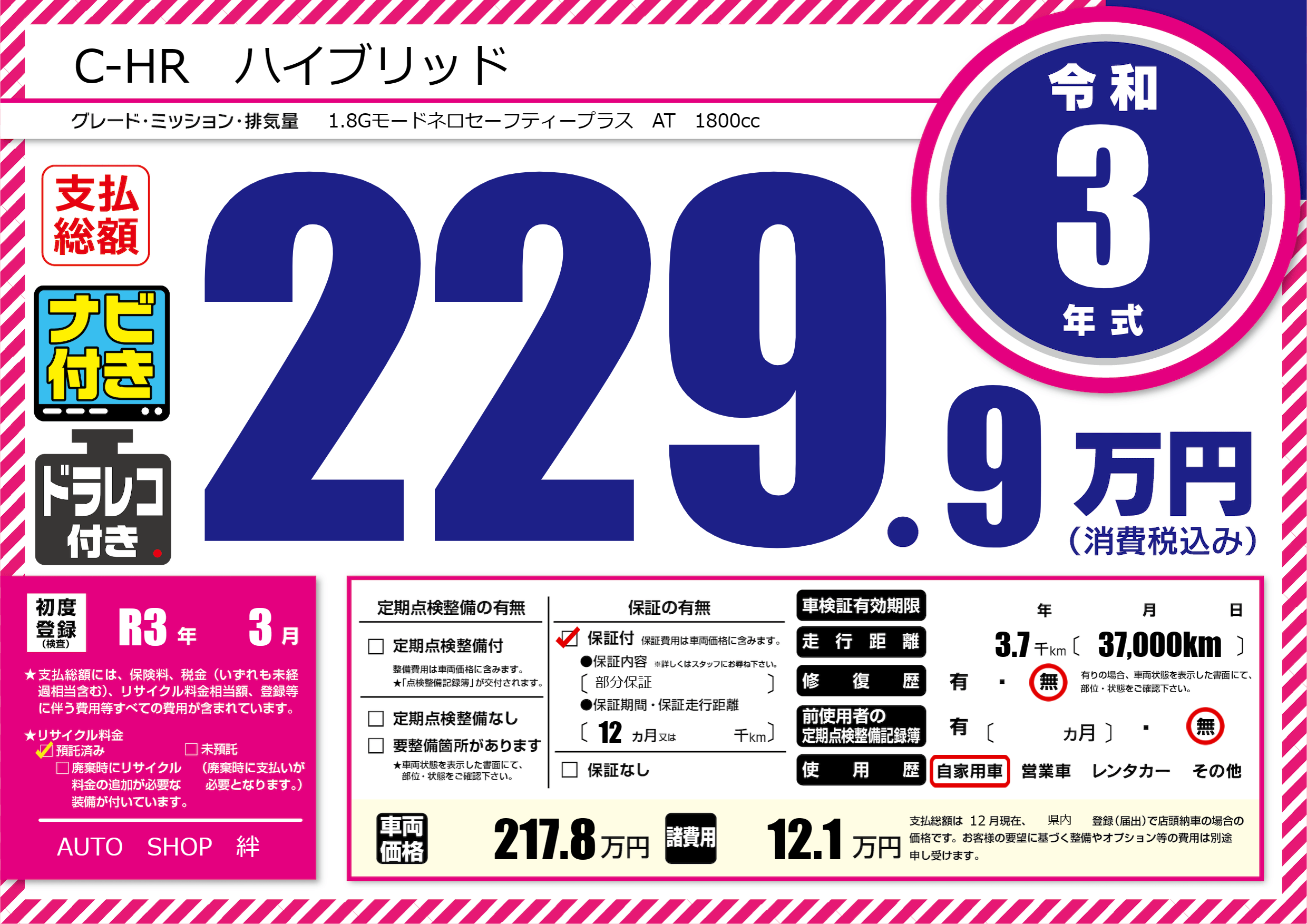 | 車名 | C-HR ハイブリッド | グレード ミッション 排気量 |