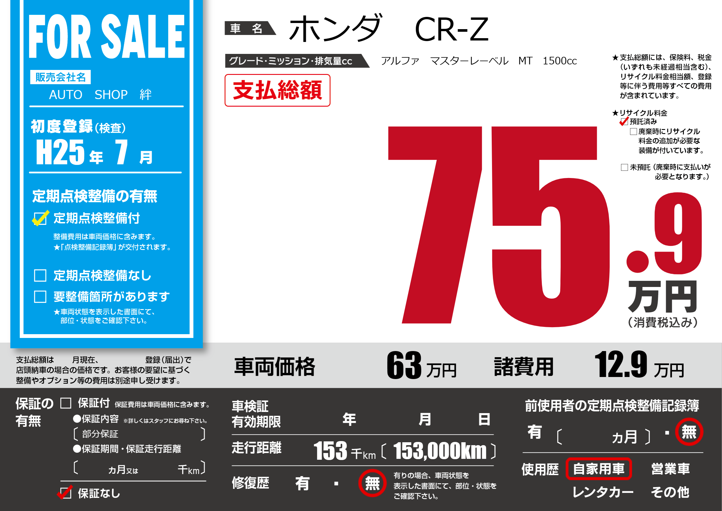 | 車名 | ホンダ CR-Z | グレード ミッション 排気量 |
