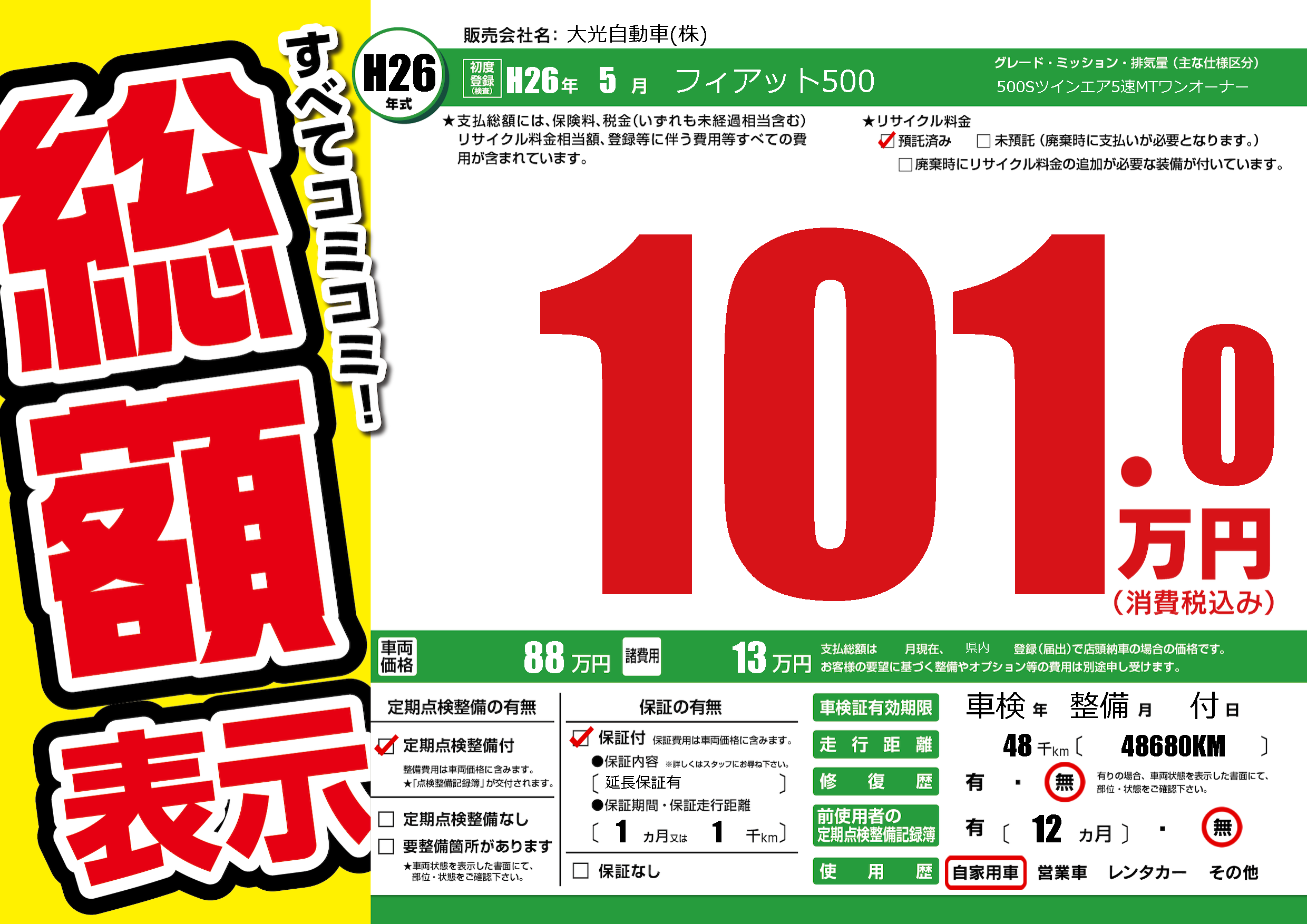 | 車名 | フィアット500 | グレード ミッション 排気量 |