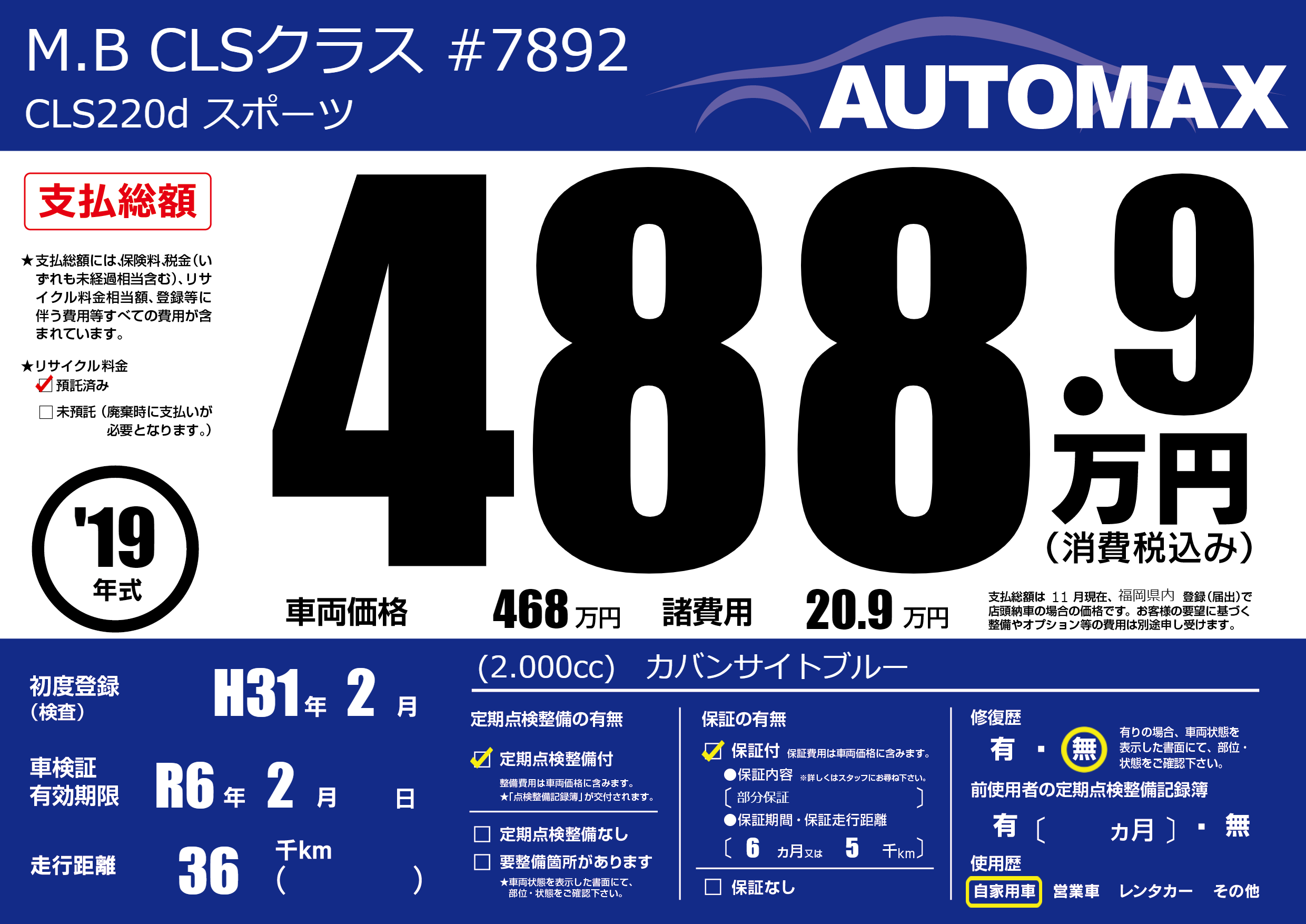 | 車名 | M.B CLSクラス #7892 | グレード ミッション 排気量 |