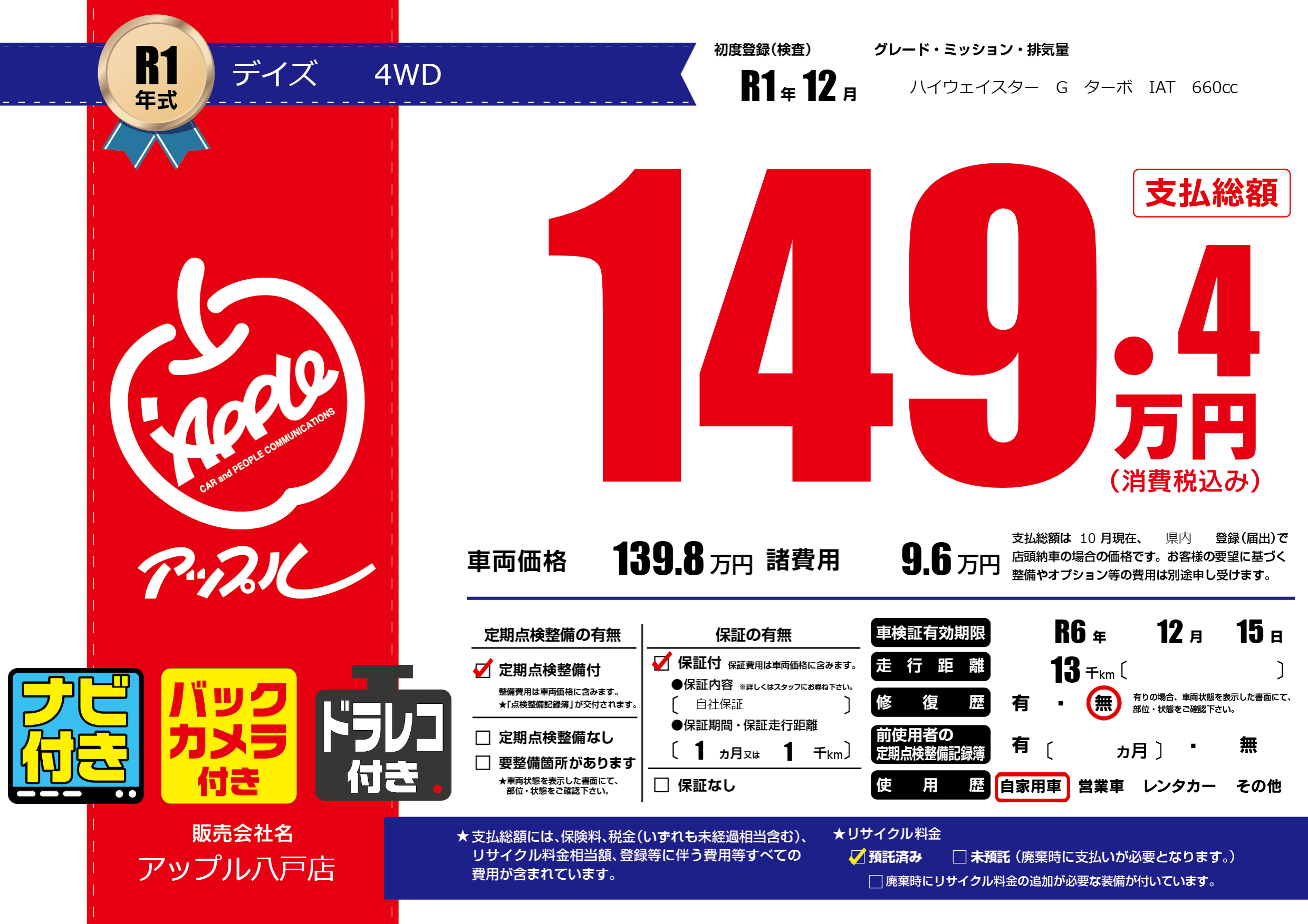 | 車検制限 | R6年 12月 15日 | ||