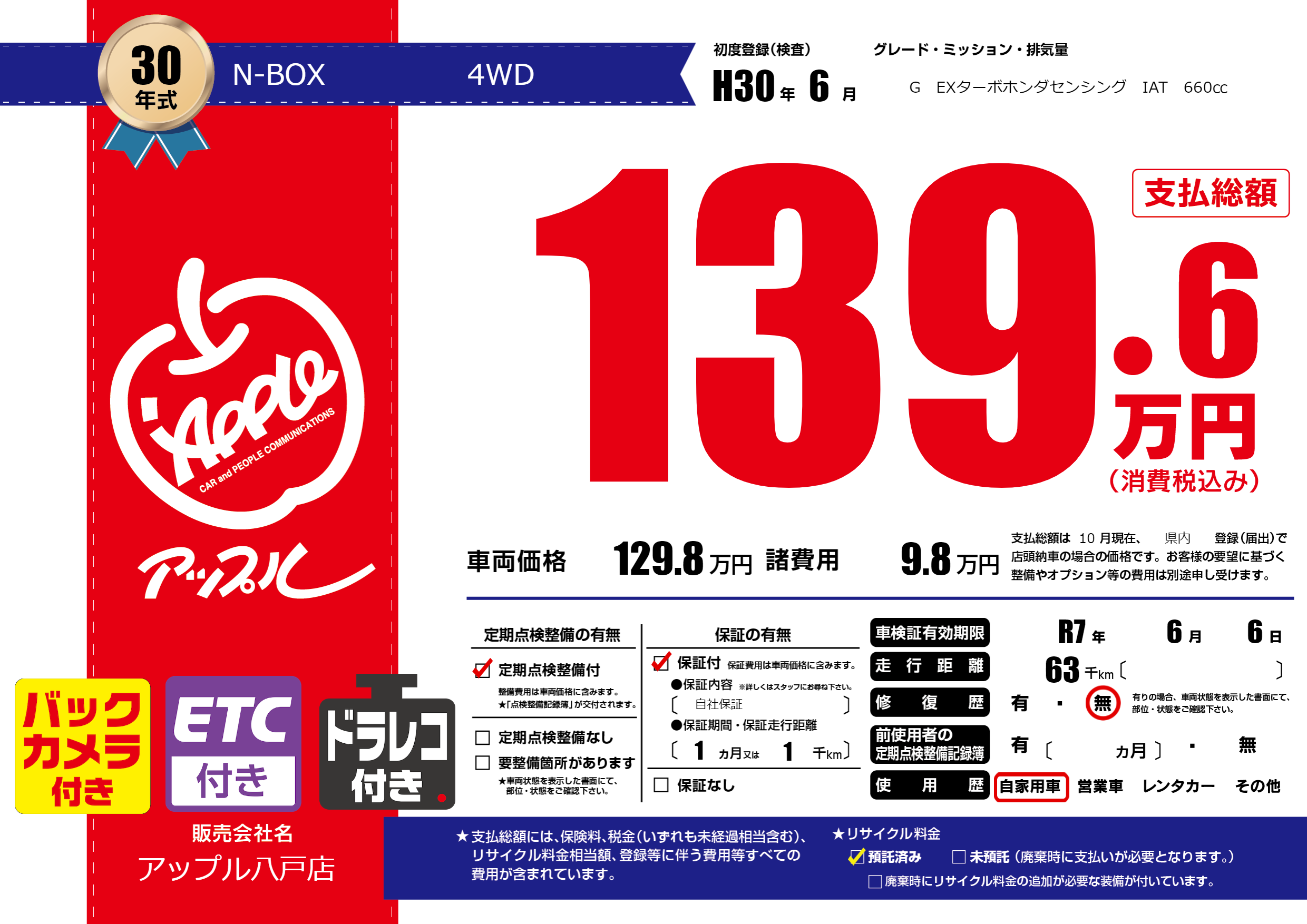 | 車名 | N-BOX 4WD | グレード ミッション 排気量 |