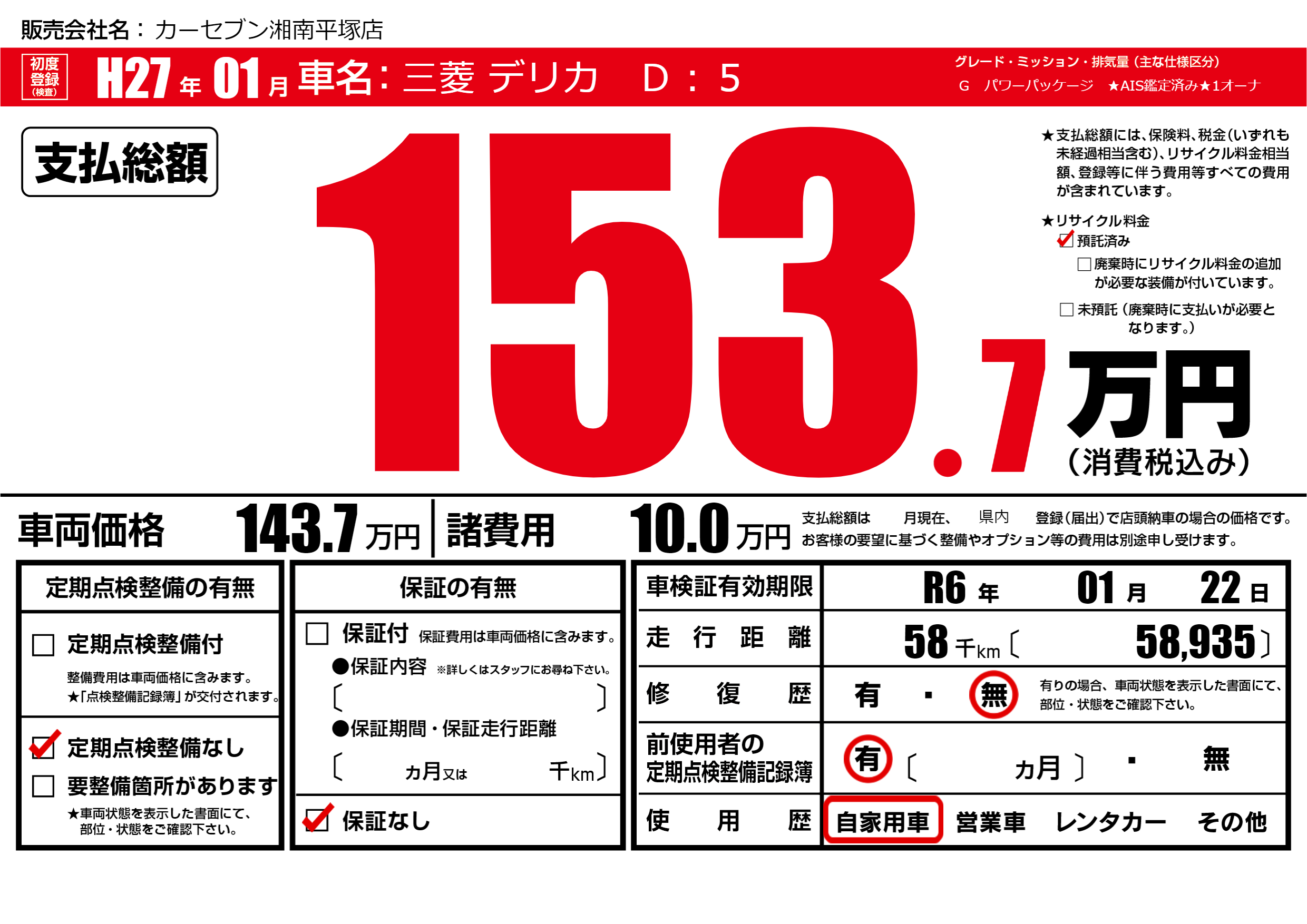 | 車名 | 三菱 デリカ D:5 | グレード ミッション 排気量 |