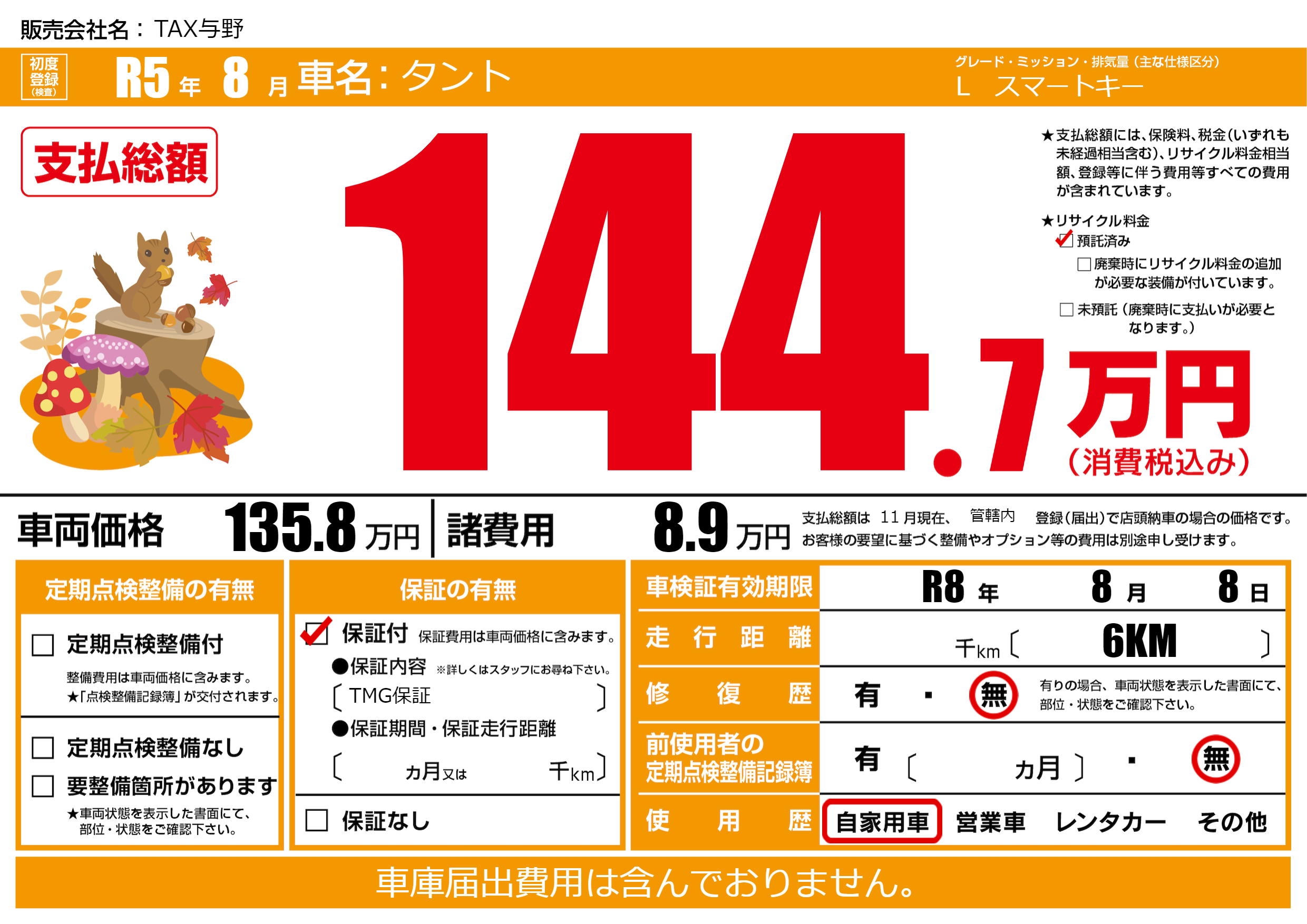 保証付き 保証内容(TMG保証) ---ヶ月または()千kmまで |