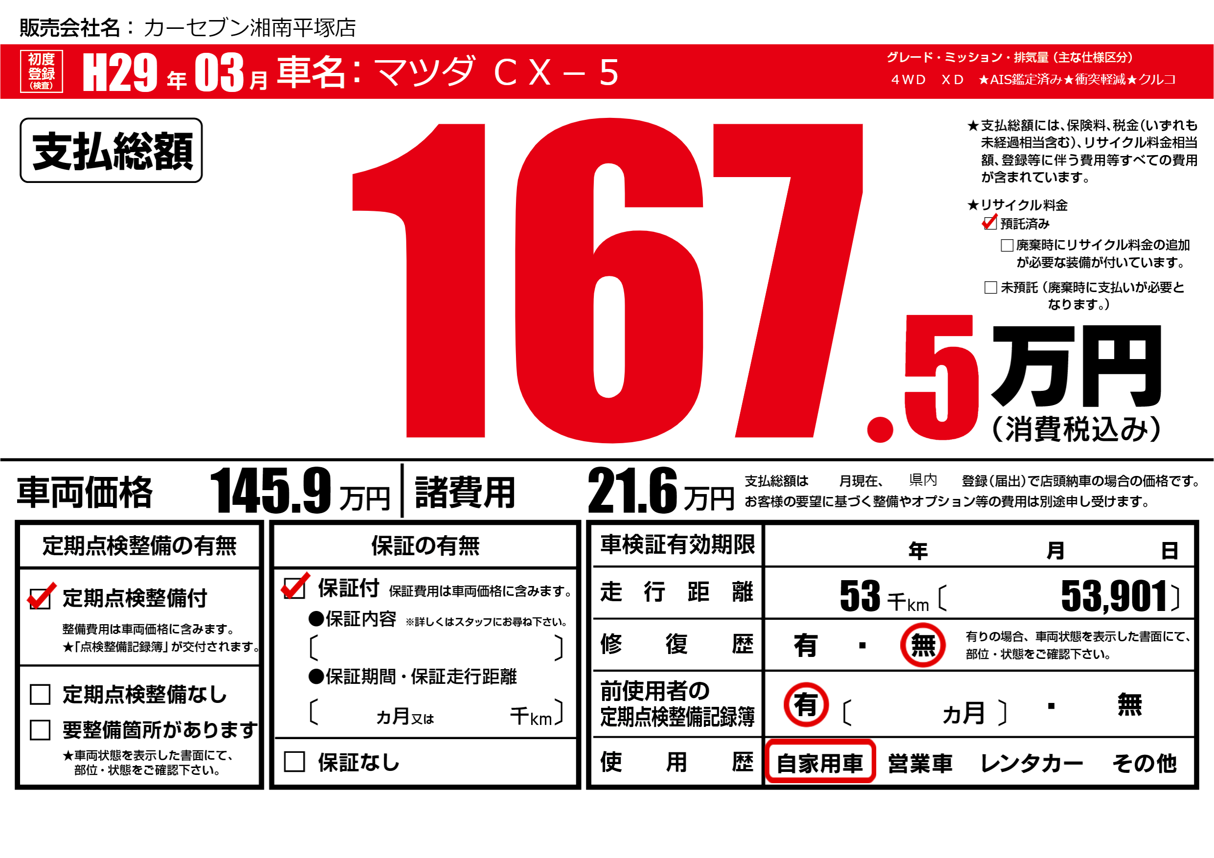 | 車名 | マツダ CX-5 | グレード ミッション 排気量 |