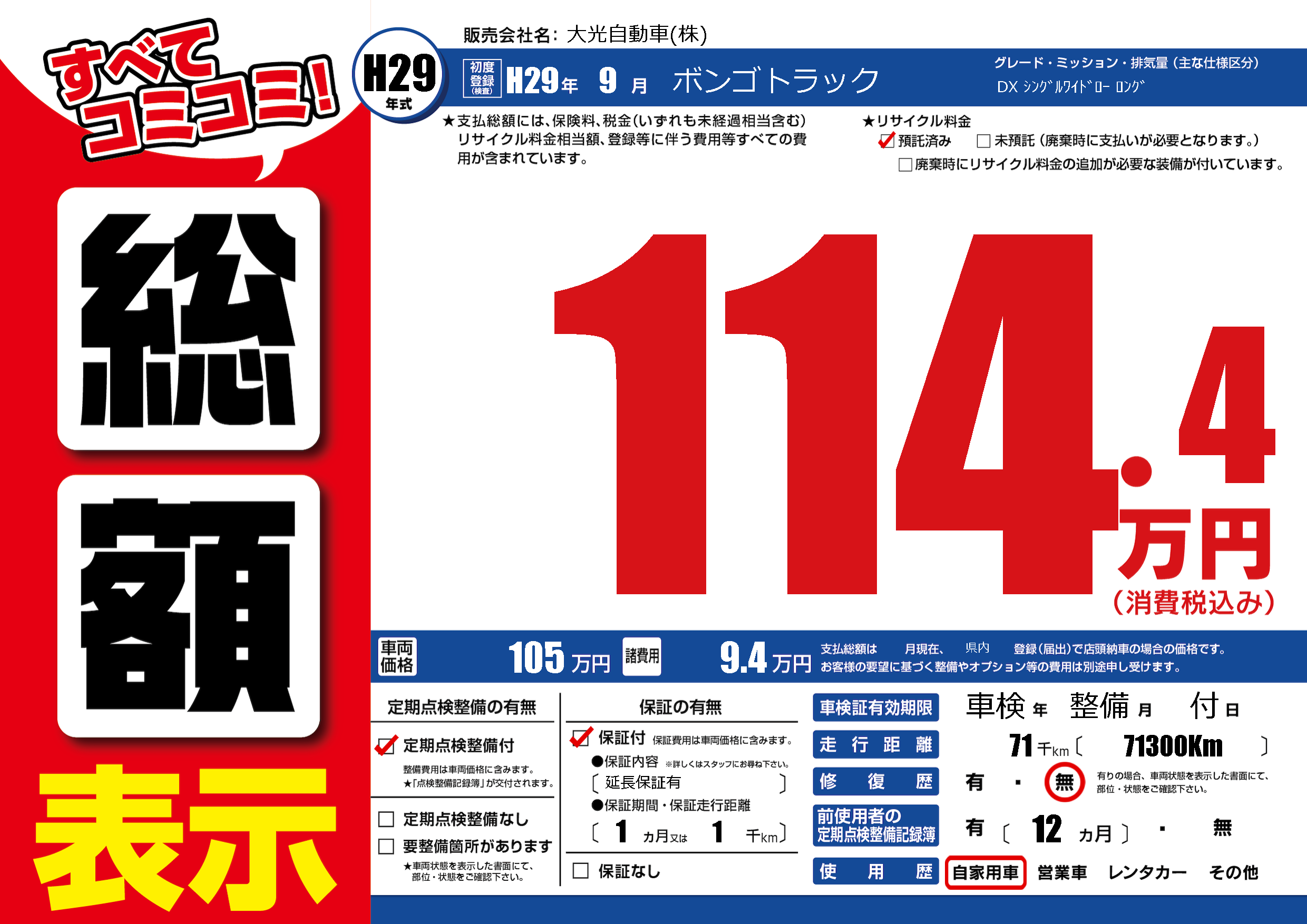 | 車名 | ボンゴトラック | グレード ミッション 排気量 |