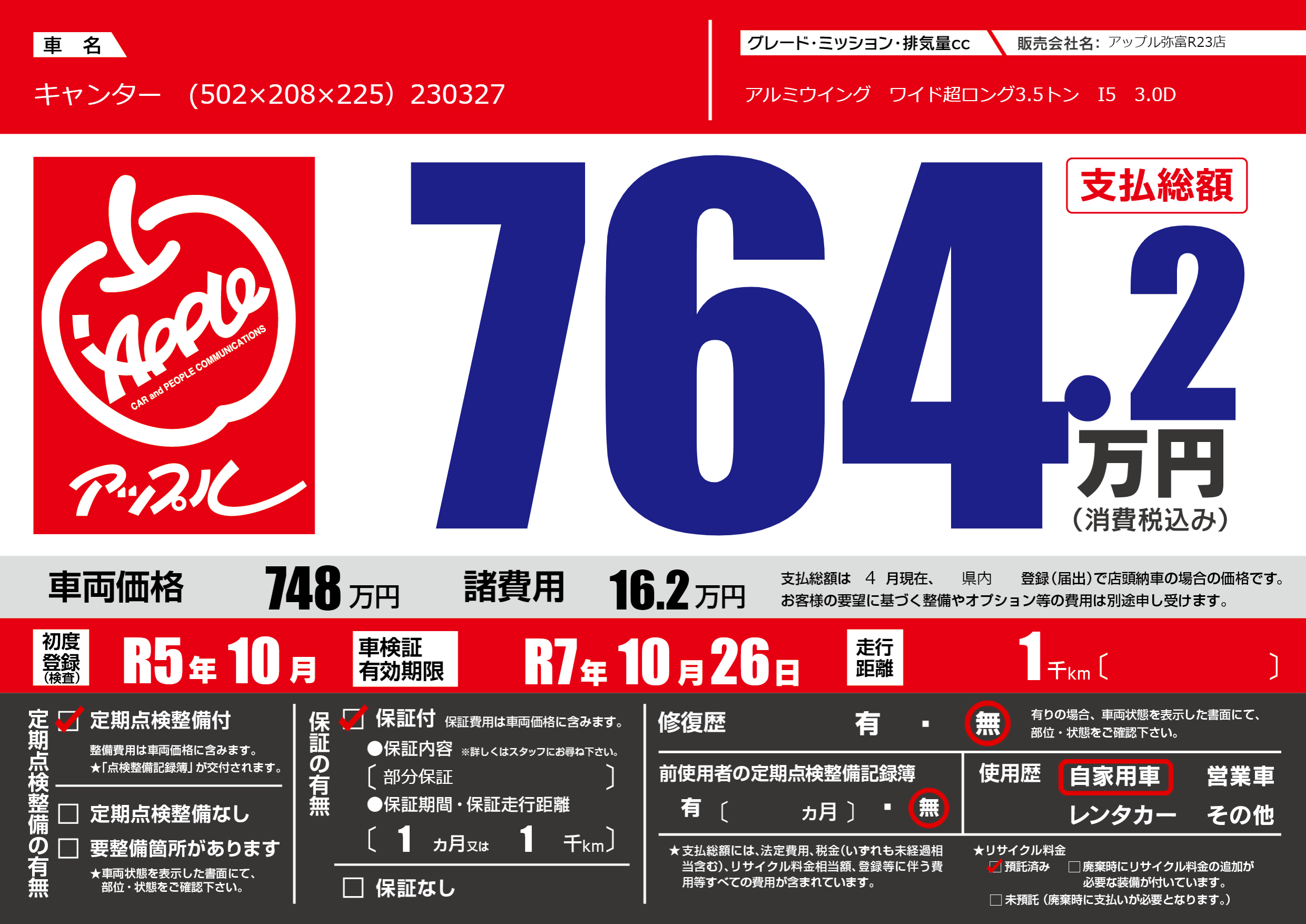 | 車名 | キャンター (502×208×225)230327 | グレード ミッション 排気量 |