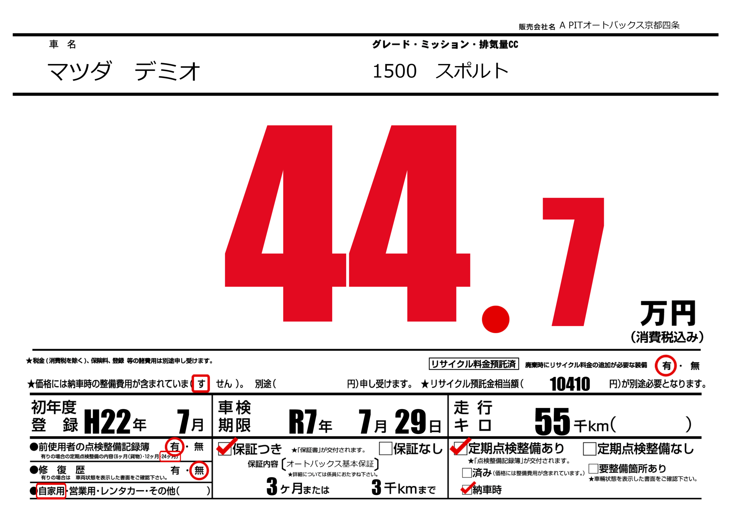 | 車名 | マツダ デミオ | グレード ミッション 排気量 |