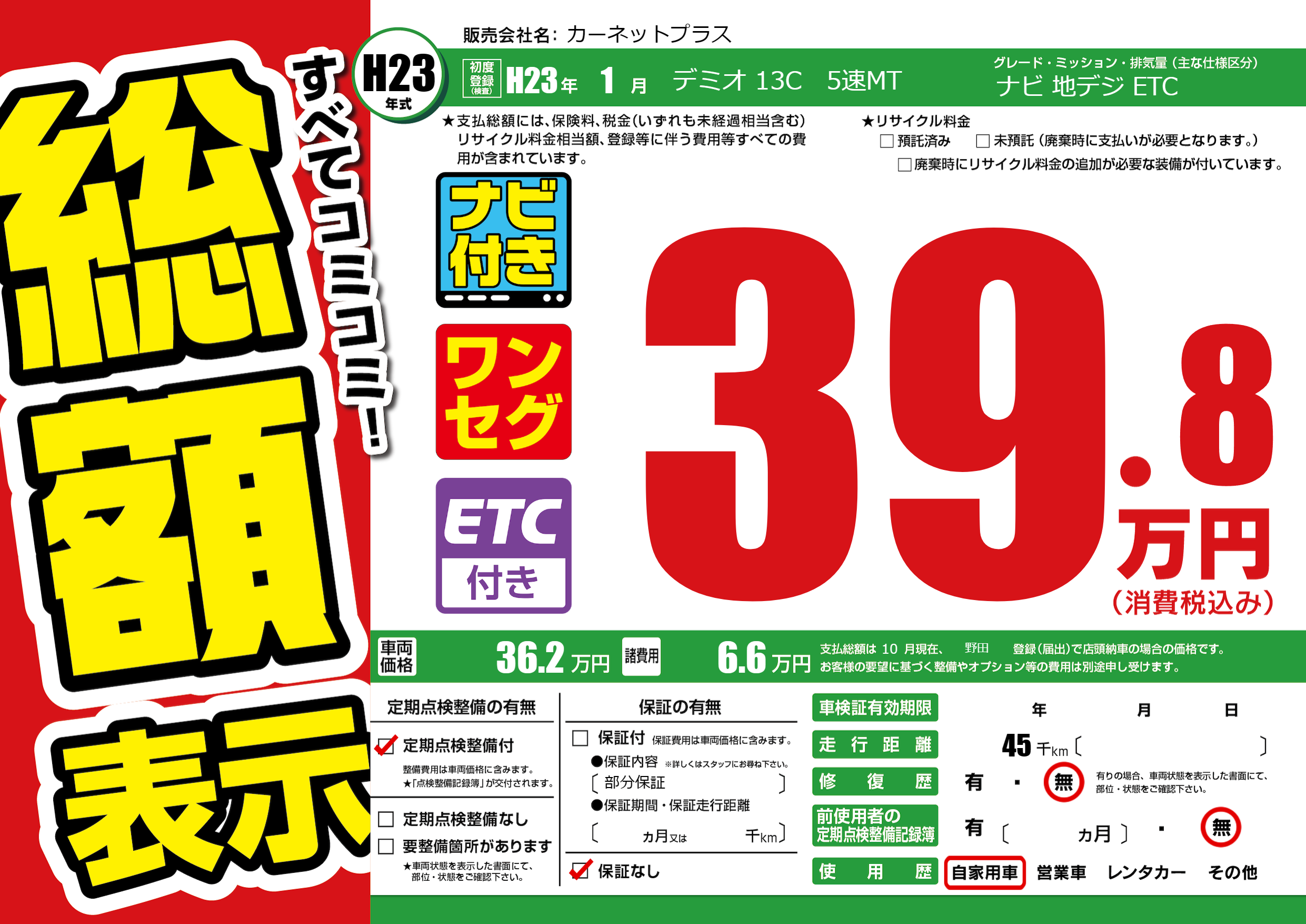 | 車名 | デミオ 13C 5速MT | グレード ミッション 排気量 |