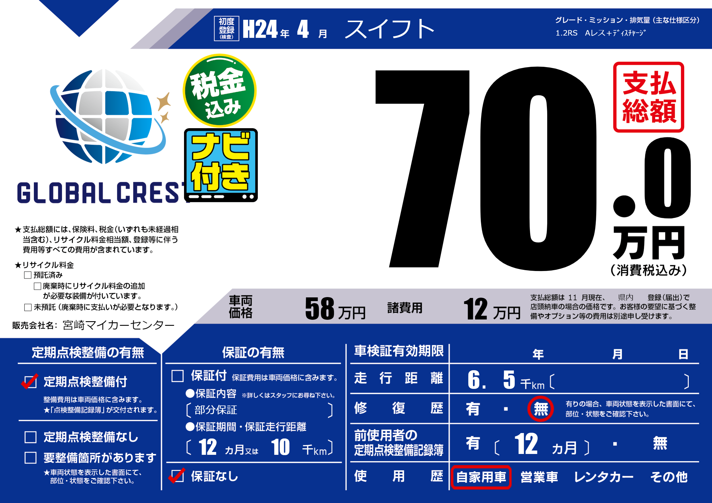 | 車名 | スイフト | グレード ミッション 排気量 |