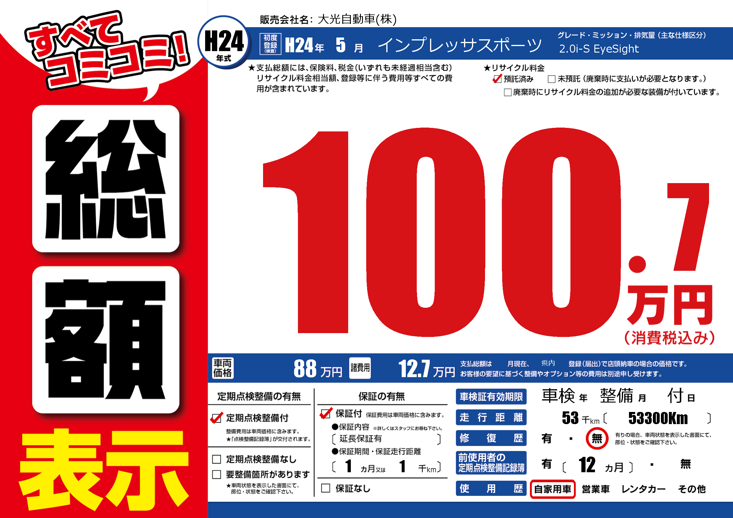 | 走行キロ | 5.3万km | 初年度登録 | H24年5月 |