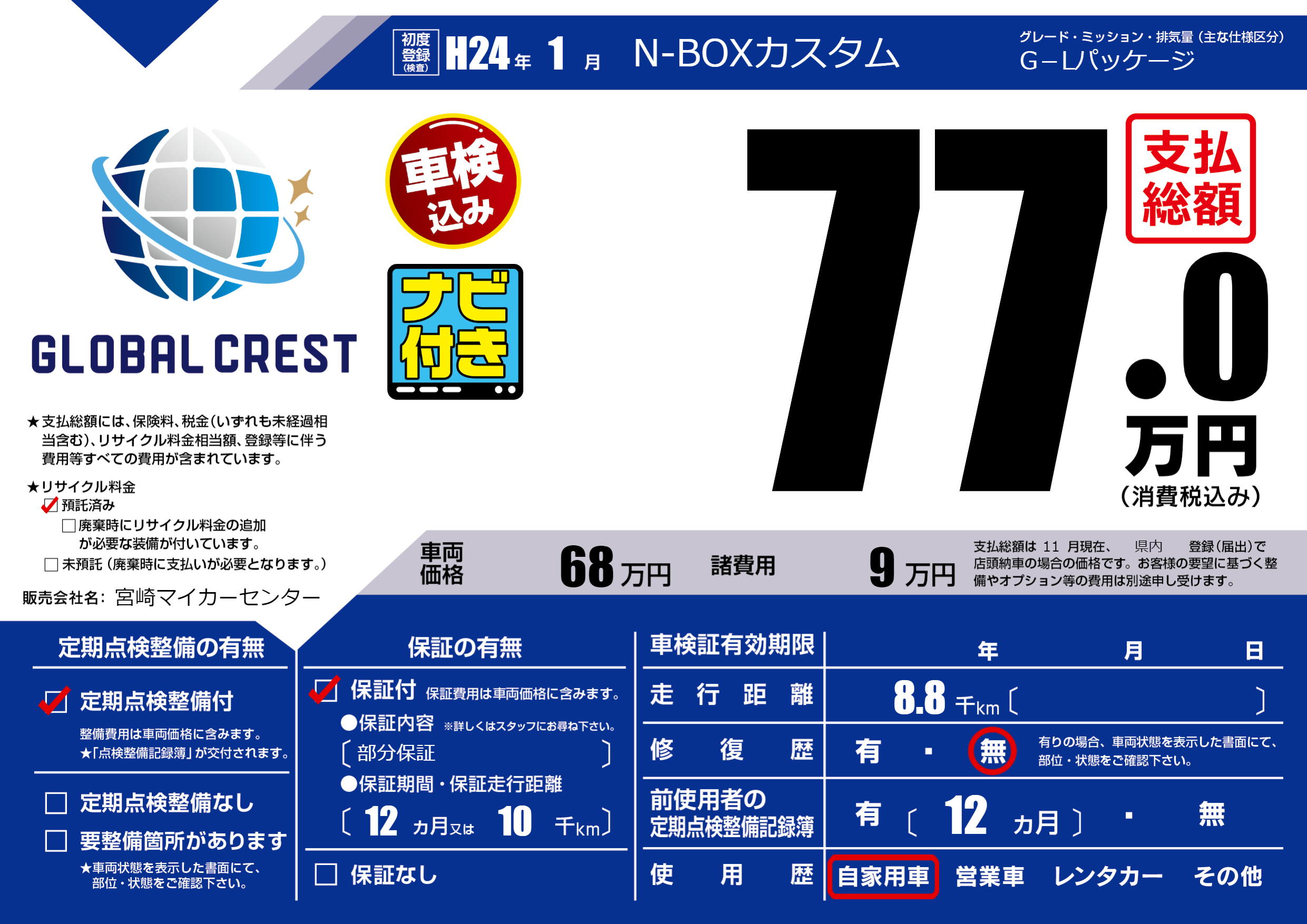 | 走行キロ | 0.8万km | 初年度登録 | H24年1月 |
