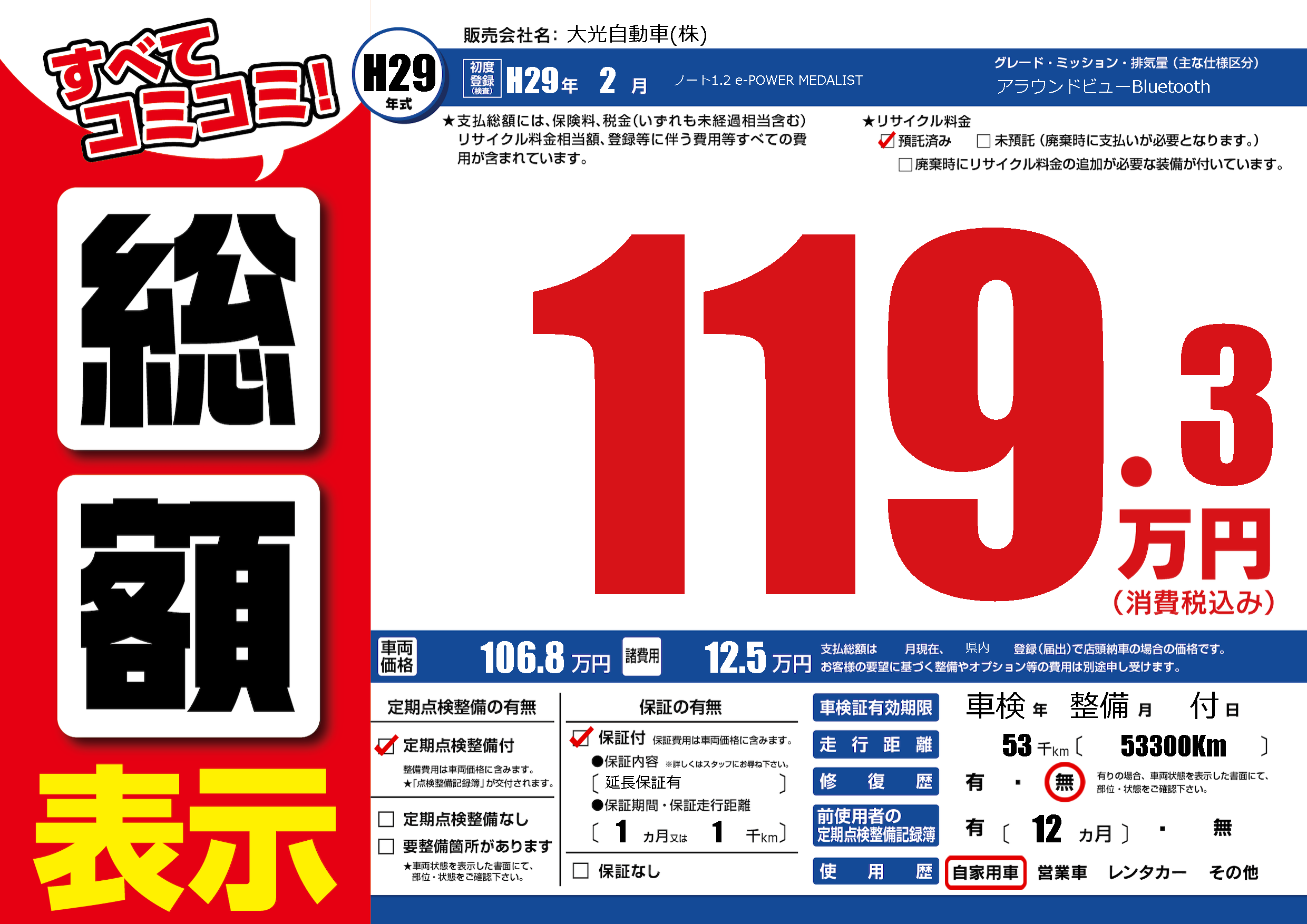 | 車名 | ノート1.2 e-POWER MEDALIST | グレード ミッション 排気量 |