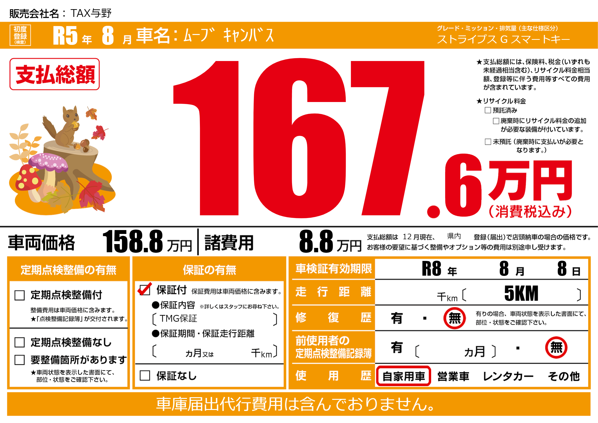 | 走行キロ | - | 初年度登録 | R5年8月 |