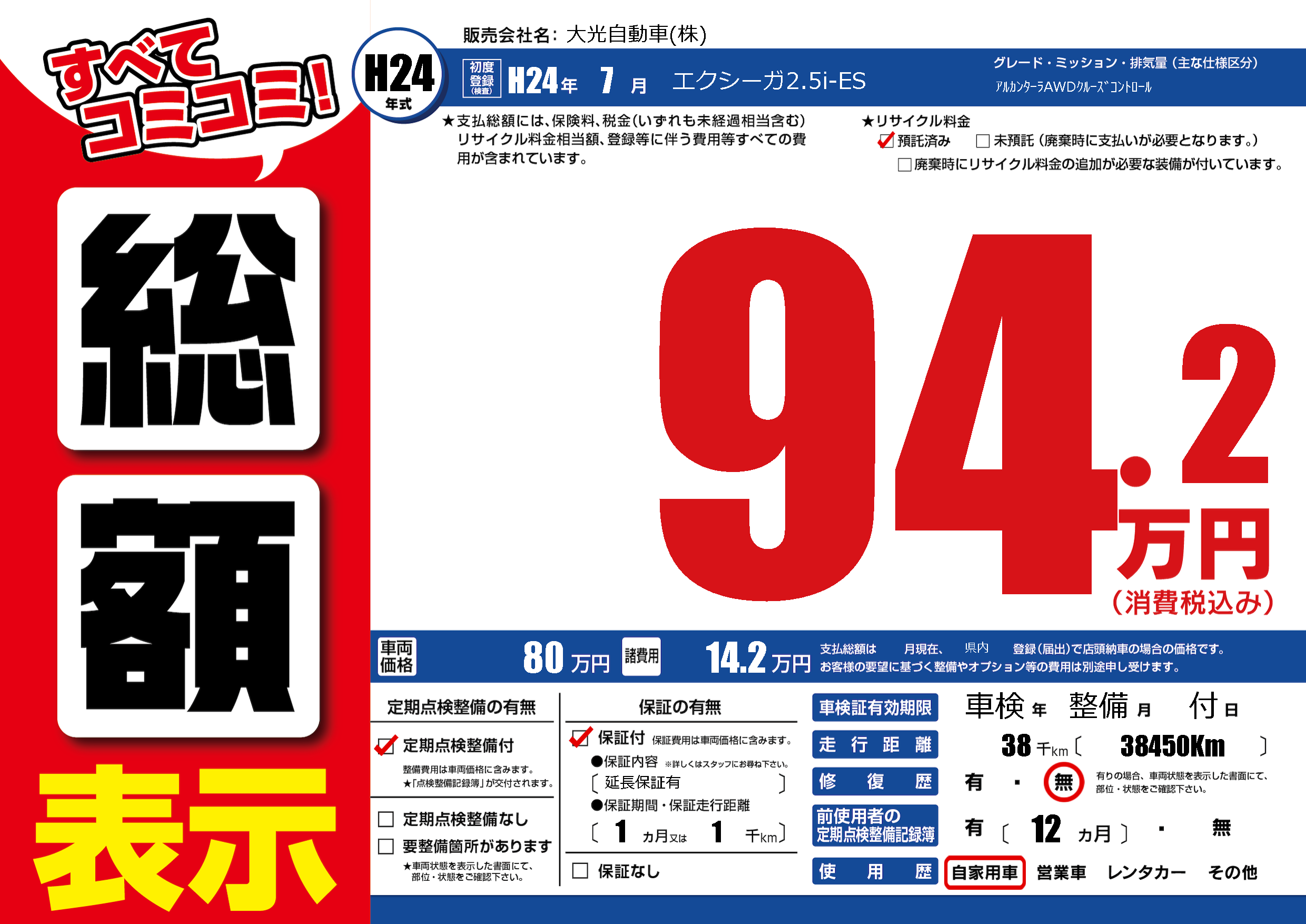 | 車名 | エクシーガ2.5i-ES | グレード ミッション 排気量 |