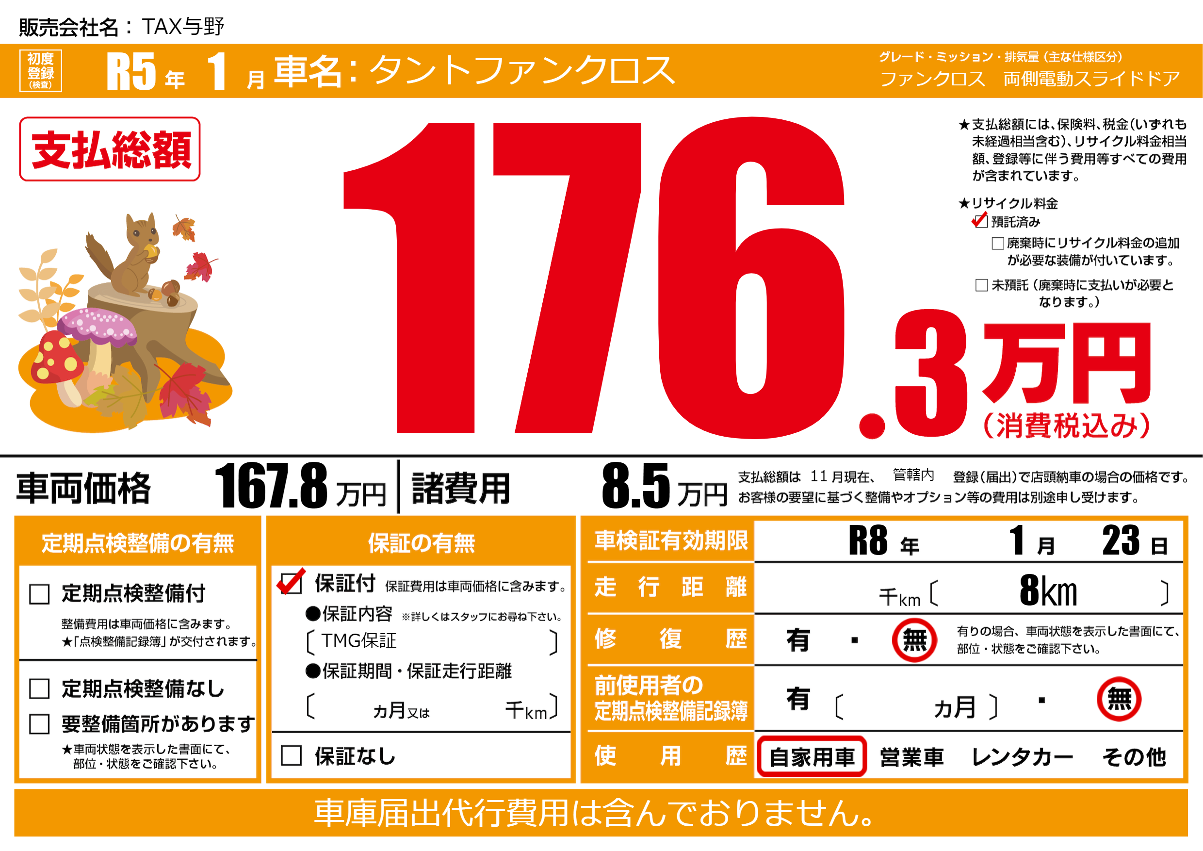 保証付き 保証内容(TMG保証) ---ヶ月または()千kmまで |