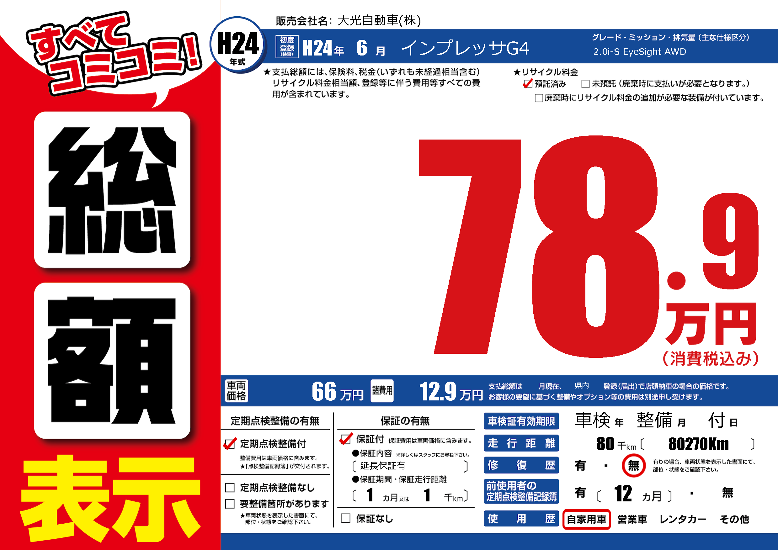 | 走行キロ | 8万km | 初年度登録 | H24年6月 |