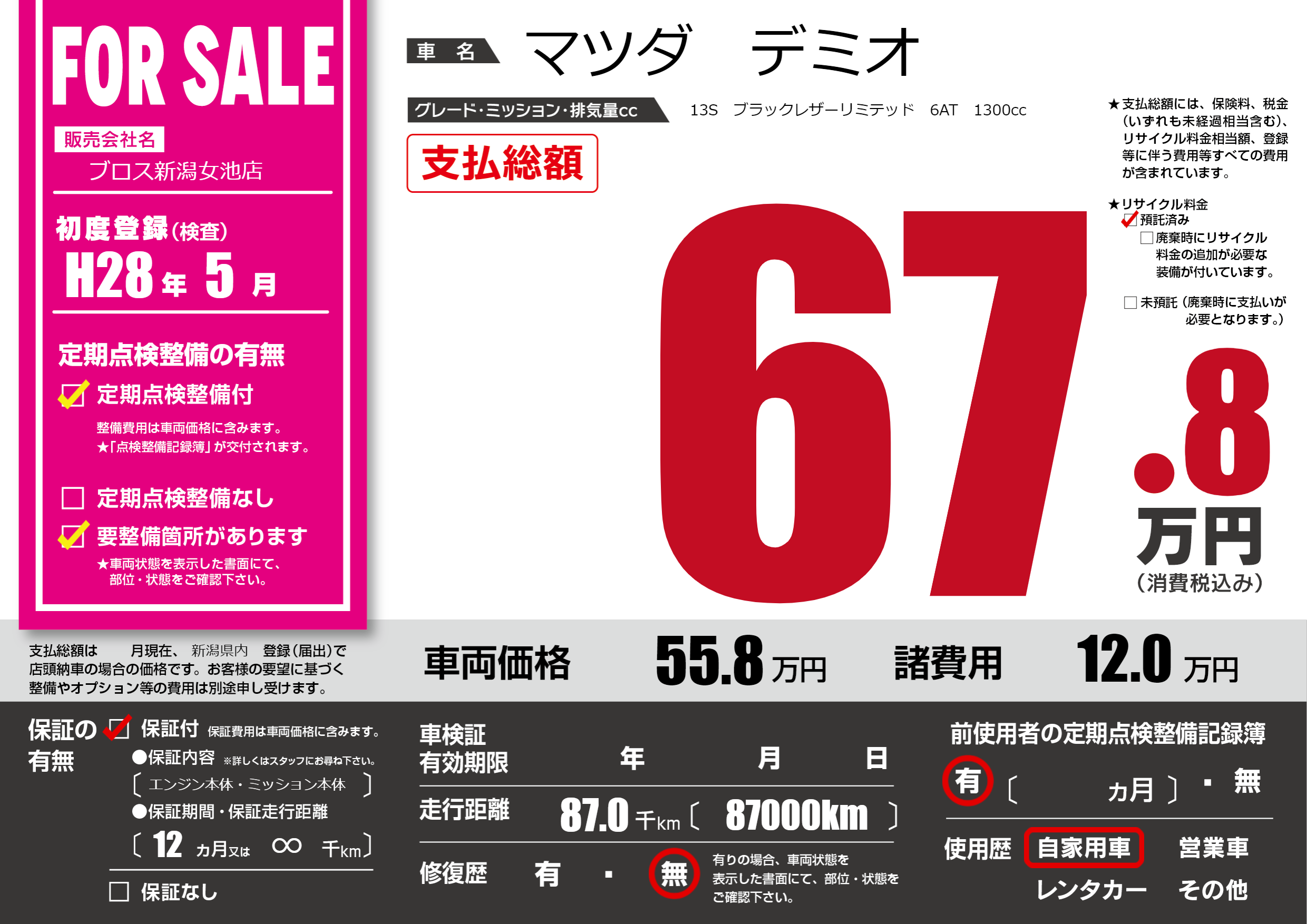 | 走行キロ | 8.7万km | 初年度登録 | H28年5月 |
