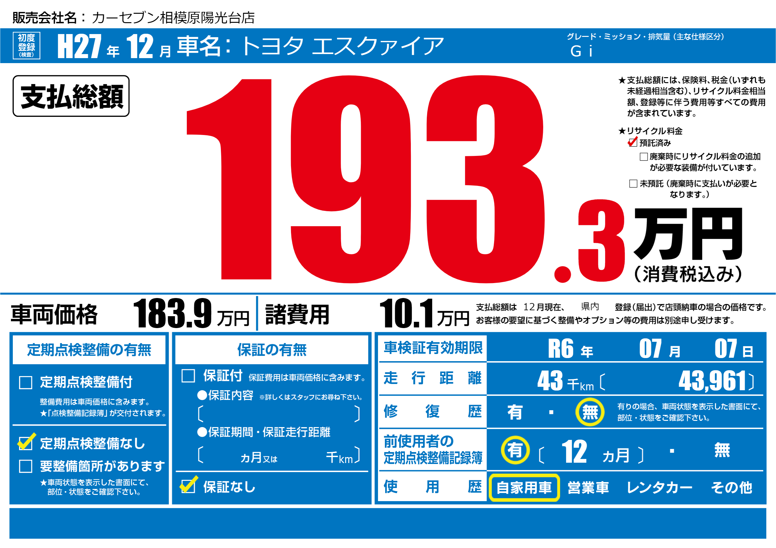 | 車名 | トヨタ エスクァイア | グレード ミッション 排気量 |