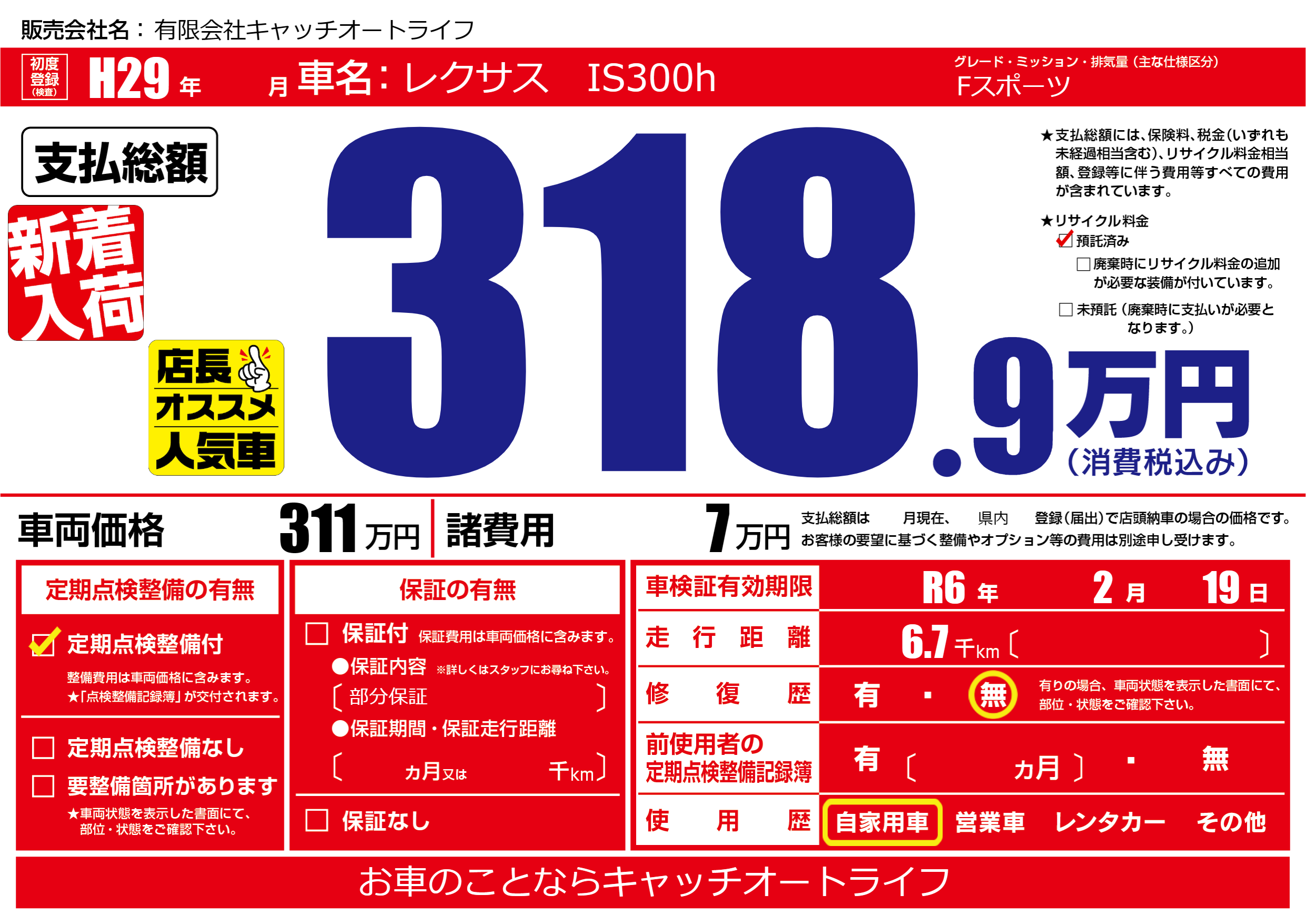| 車名 | レクサス IS300h | グレード ミッション 排気量 |