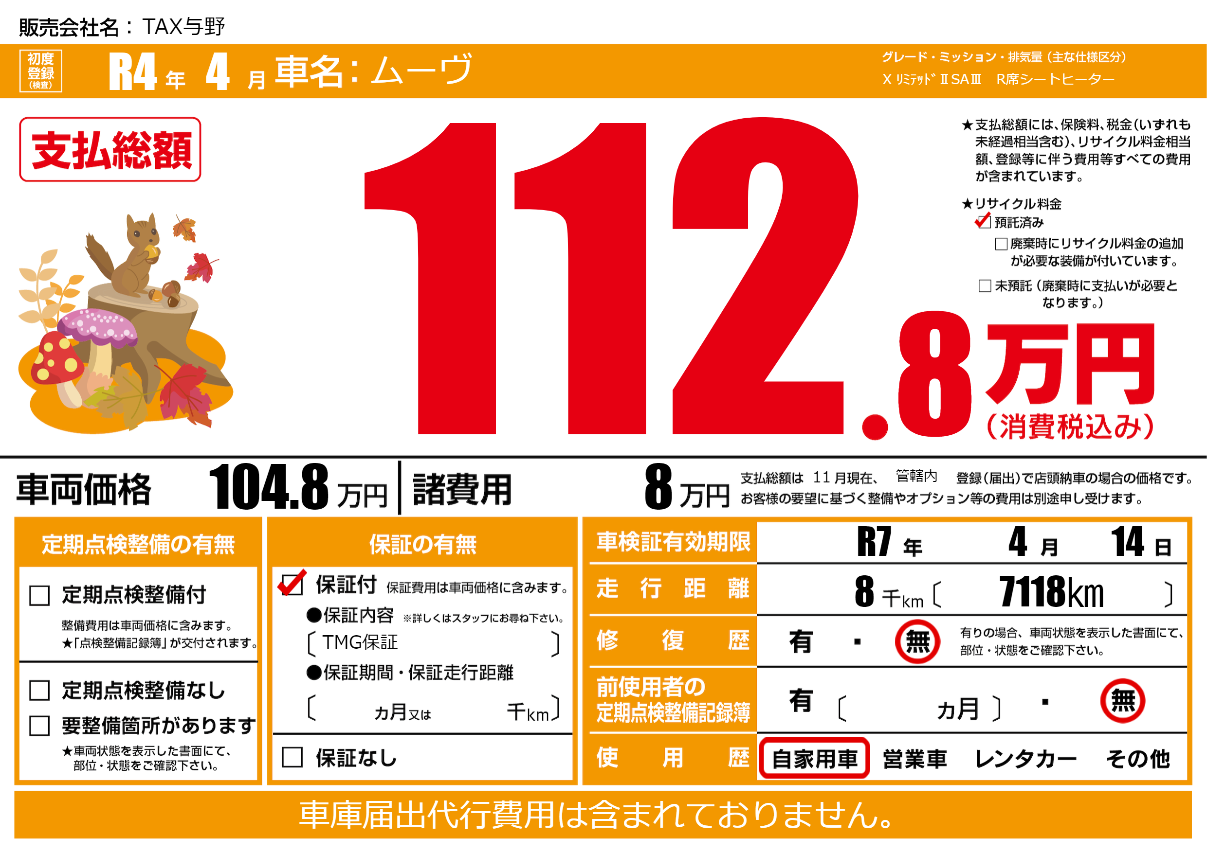 保証付き 保証内容(TMG保証) ---ヶ月または()千kmまで |
