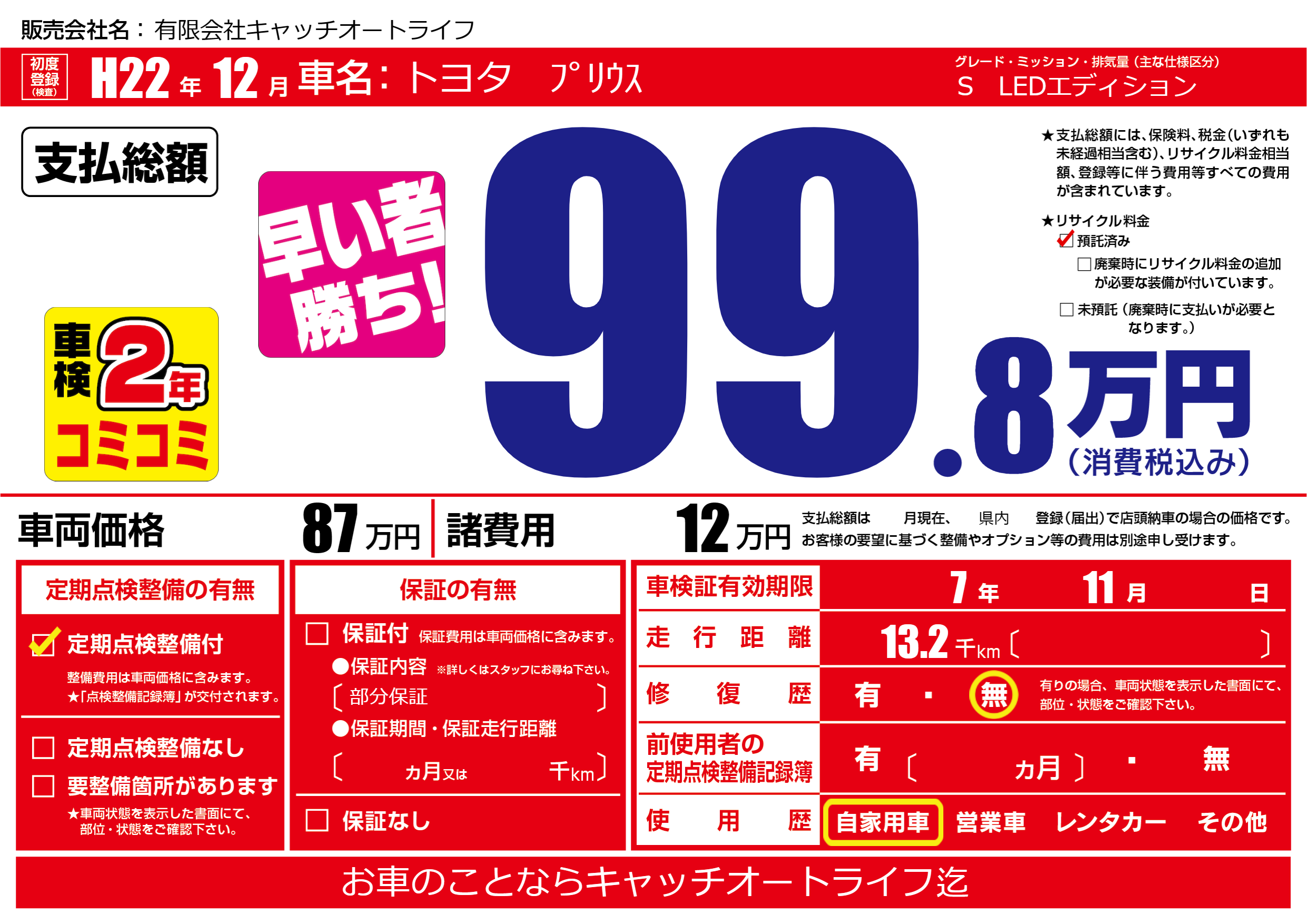 | 走行キロ | 1.3万km | 初年度登録 | H22年12月 |