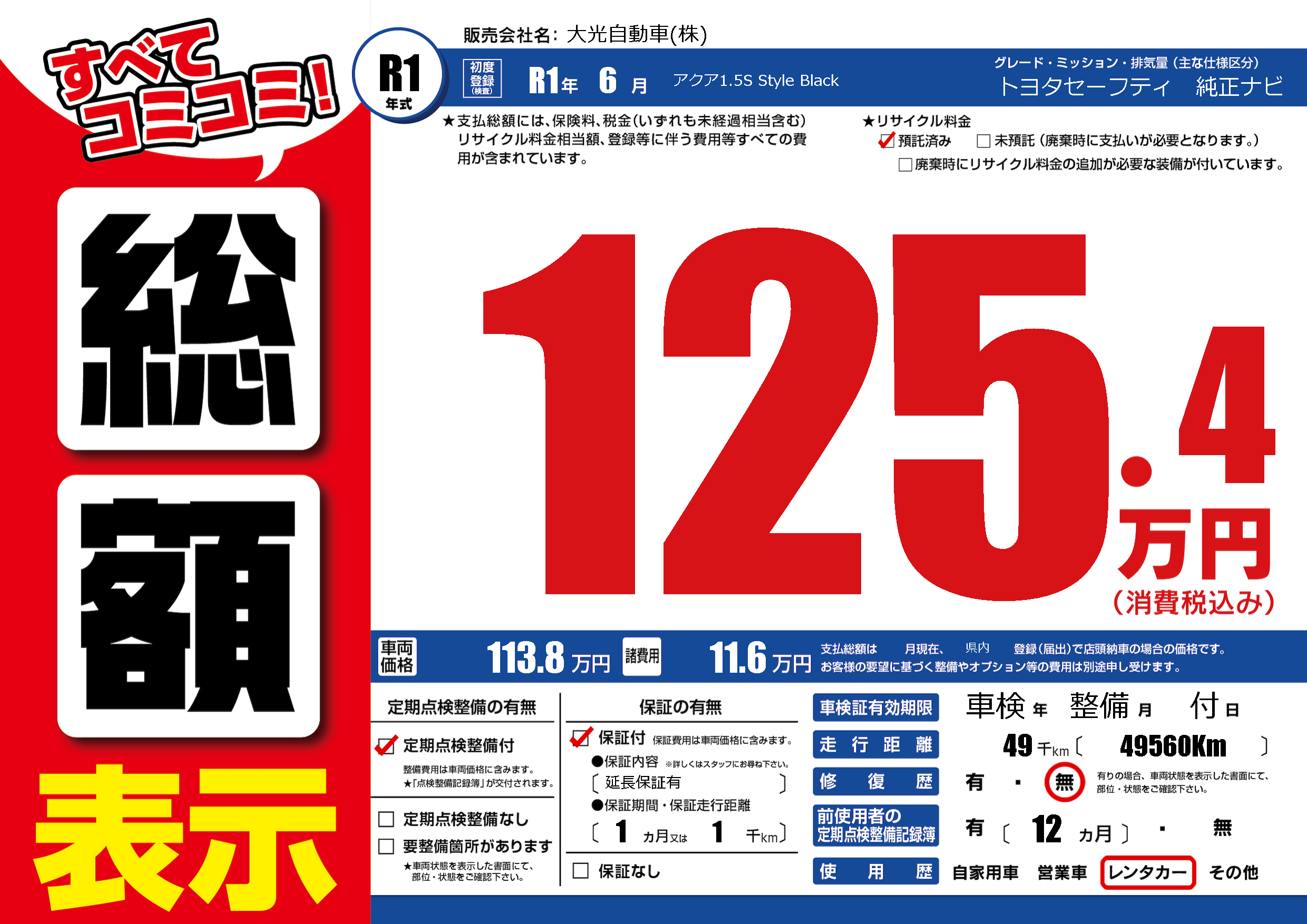 | 走行キロ | 4.9万km | 初年度登録 | R1年6月 |