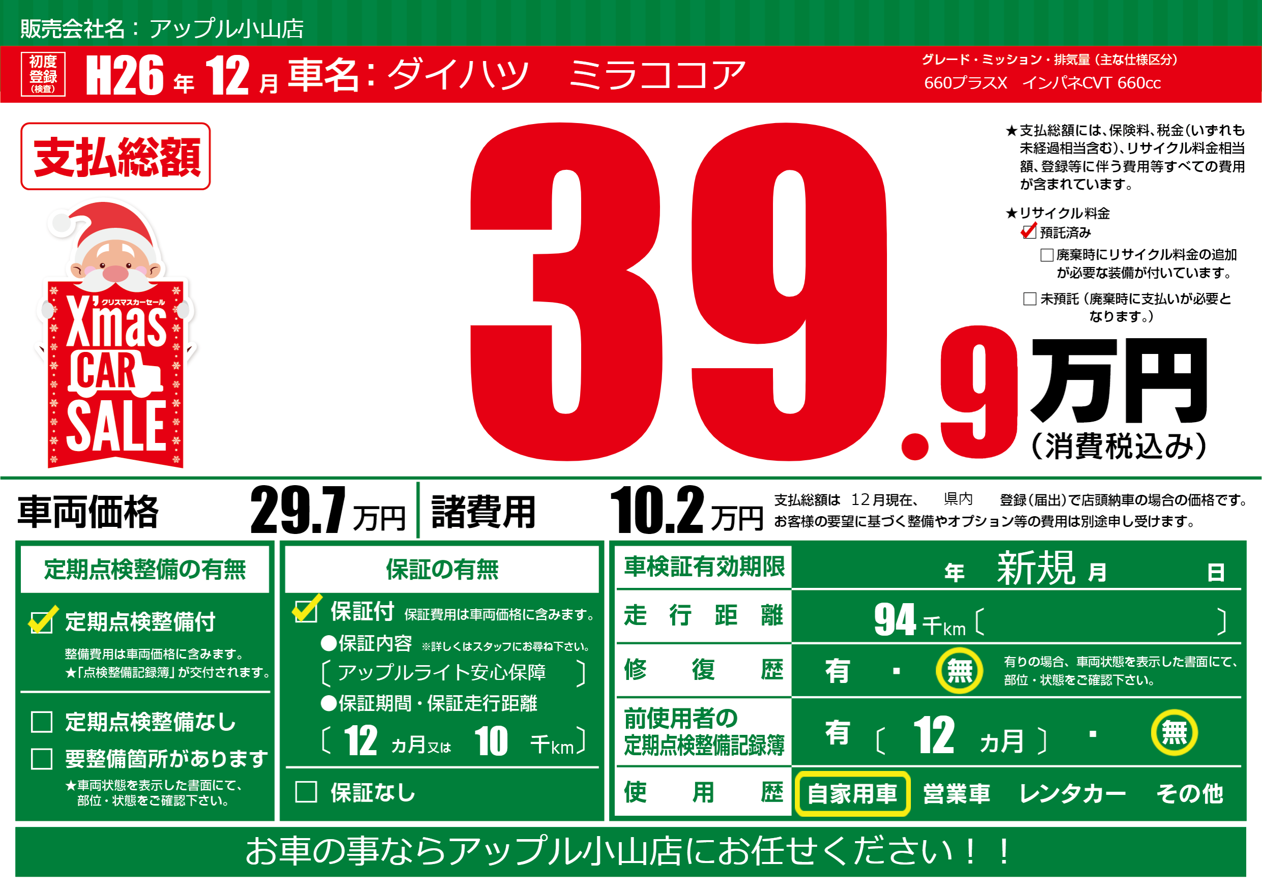 保証付き 保証内容(アップルライト安心保障) 12ヶ月または10千km |
