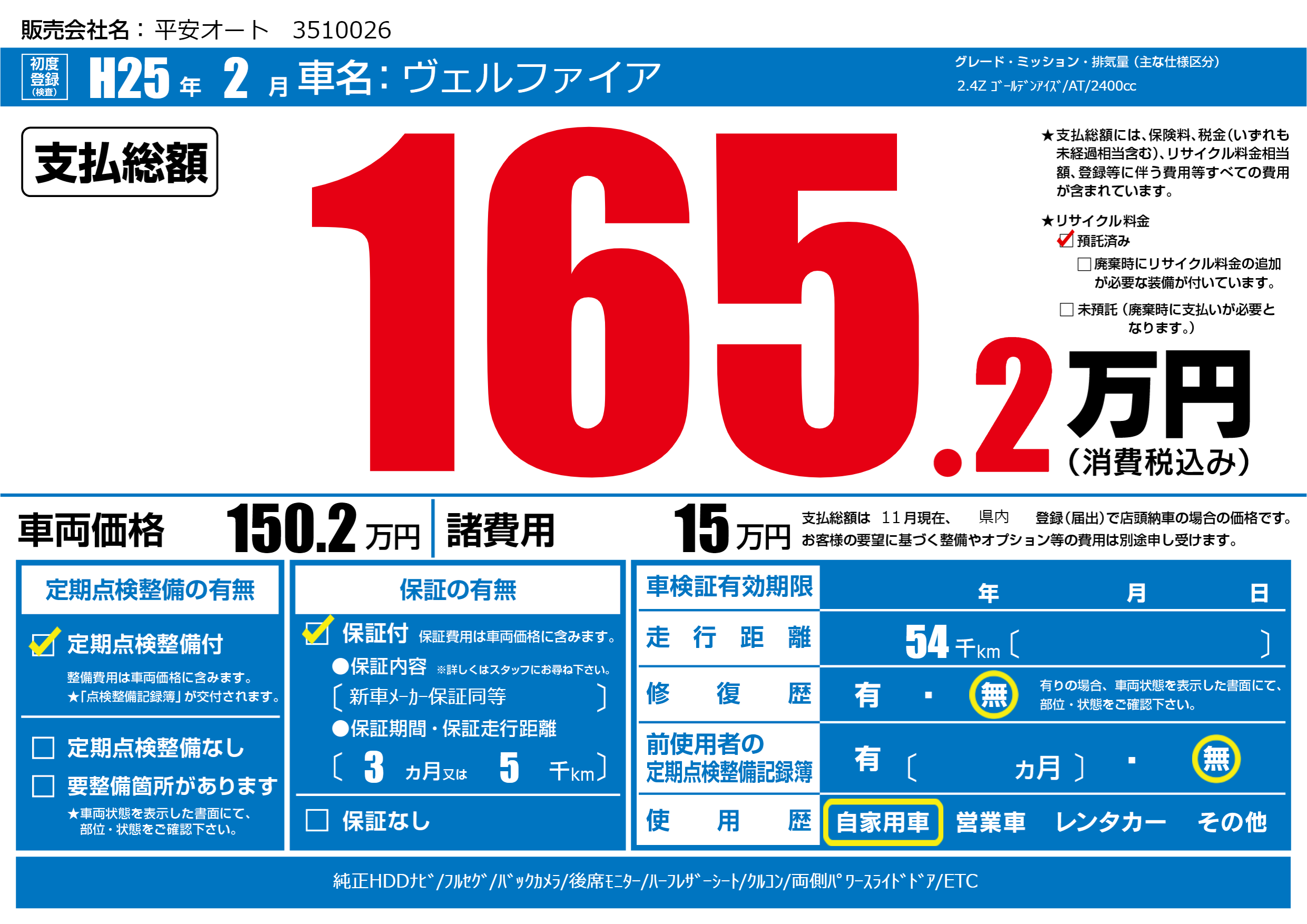 | 車名 | ヴェルファイア | グレード ミッション 排気量 |