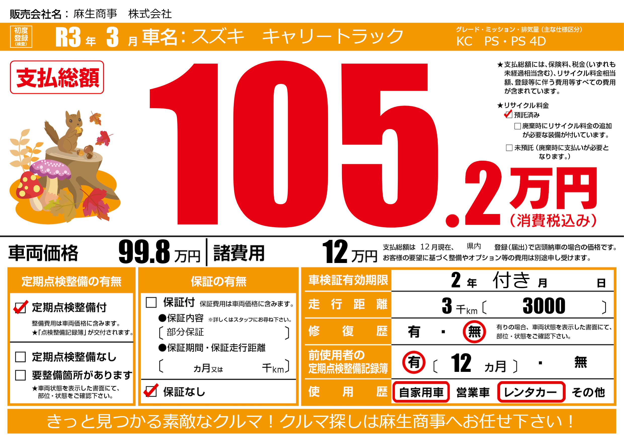 | 車名 | スズキ キャリートラック | グレード ミッション 排気量 |