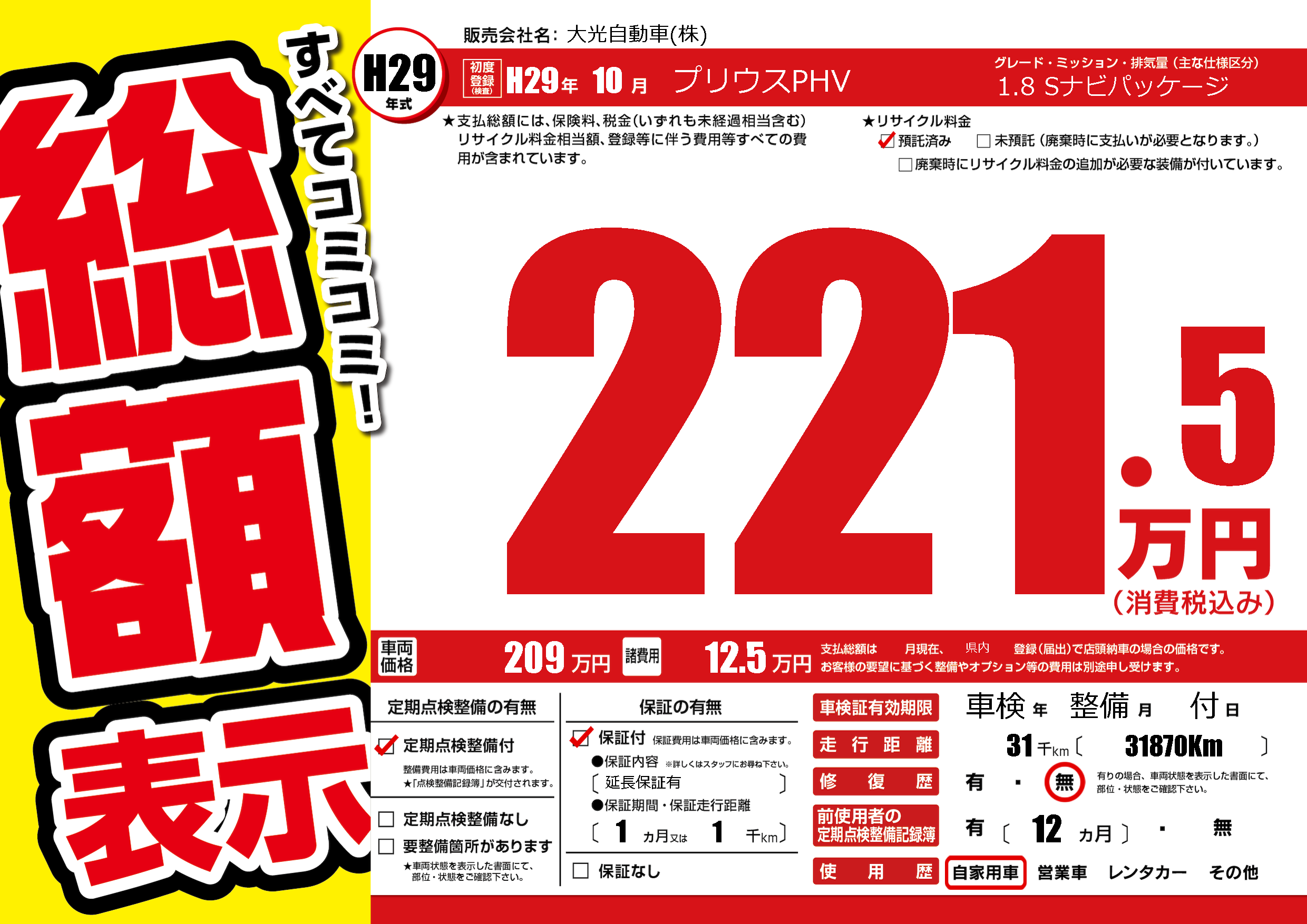 | 車名 | プリウスPHV | グレード ミッション 排気量 |