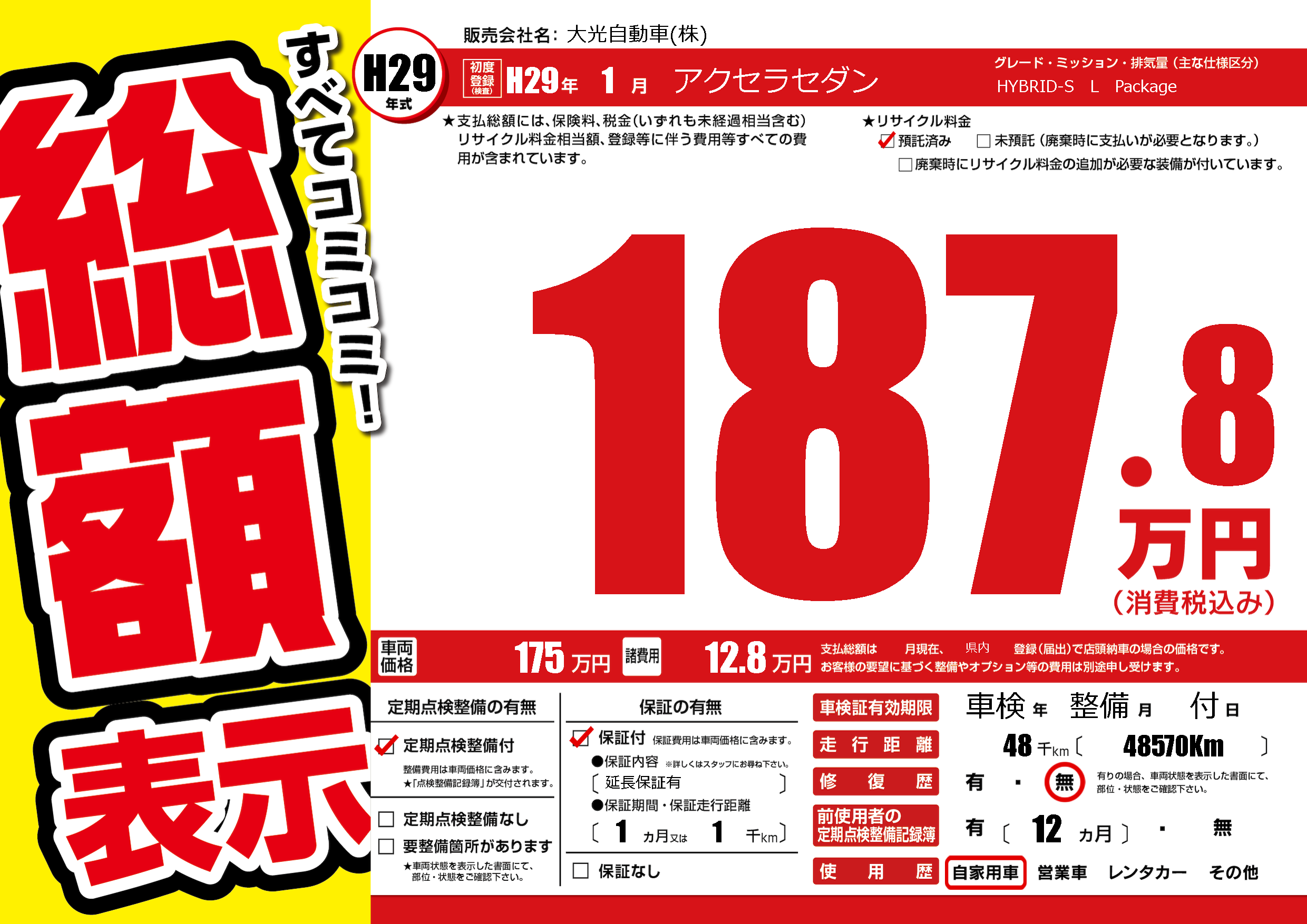 | 車名 | アクセラセダン | グレード ミッション 排気量 |