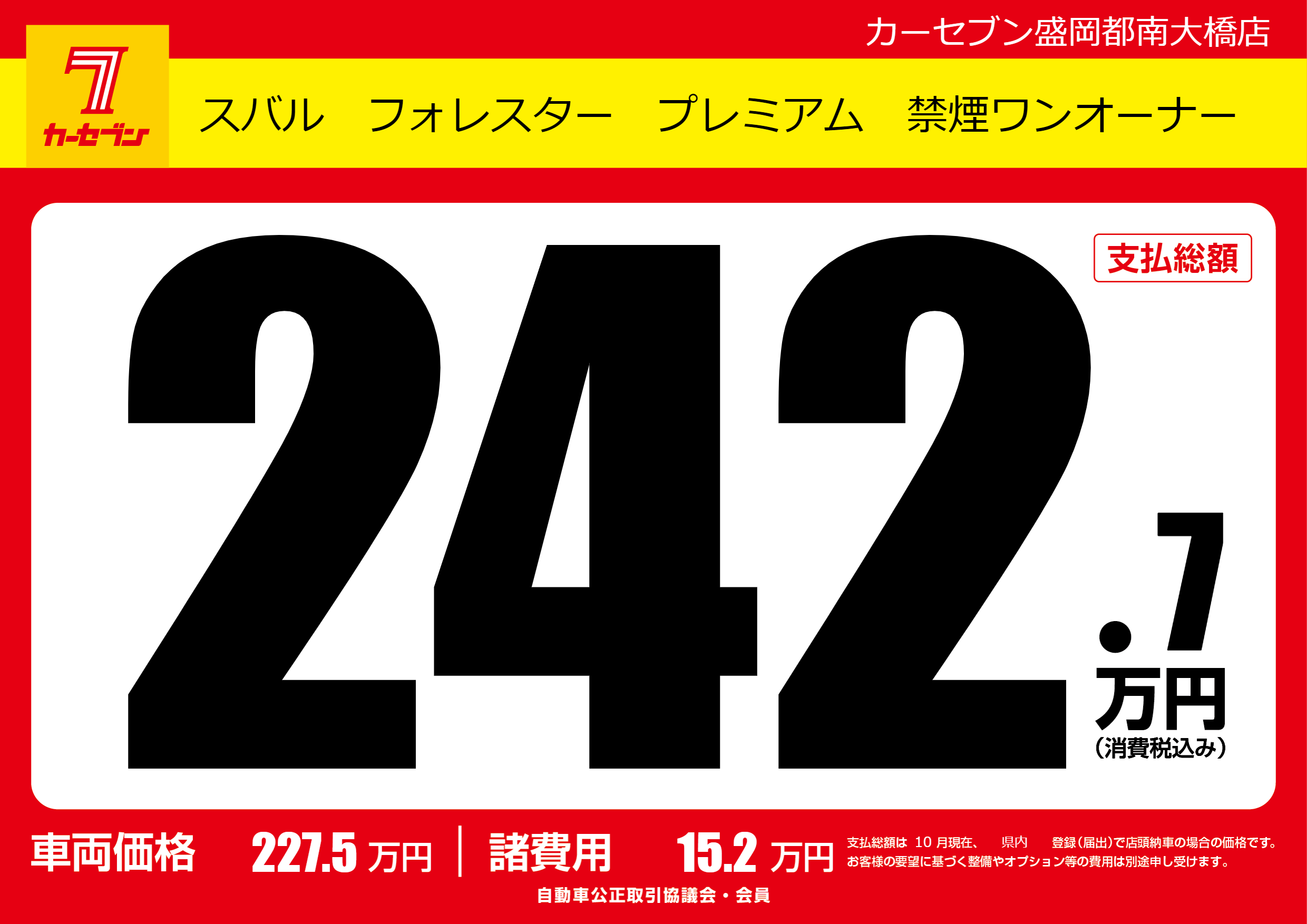 | 車名 | スバル フォレスター プレミアム 禁煙ワンオーナー | グレード ミッション 排気量 |