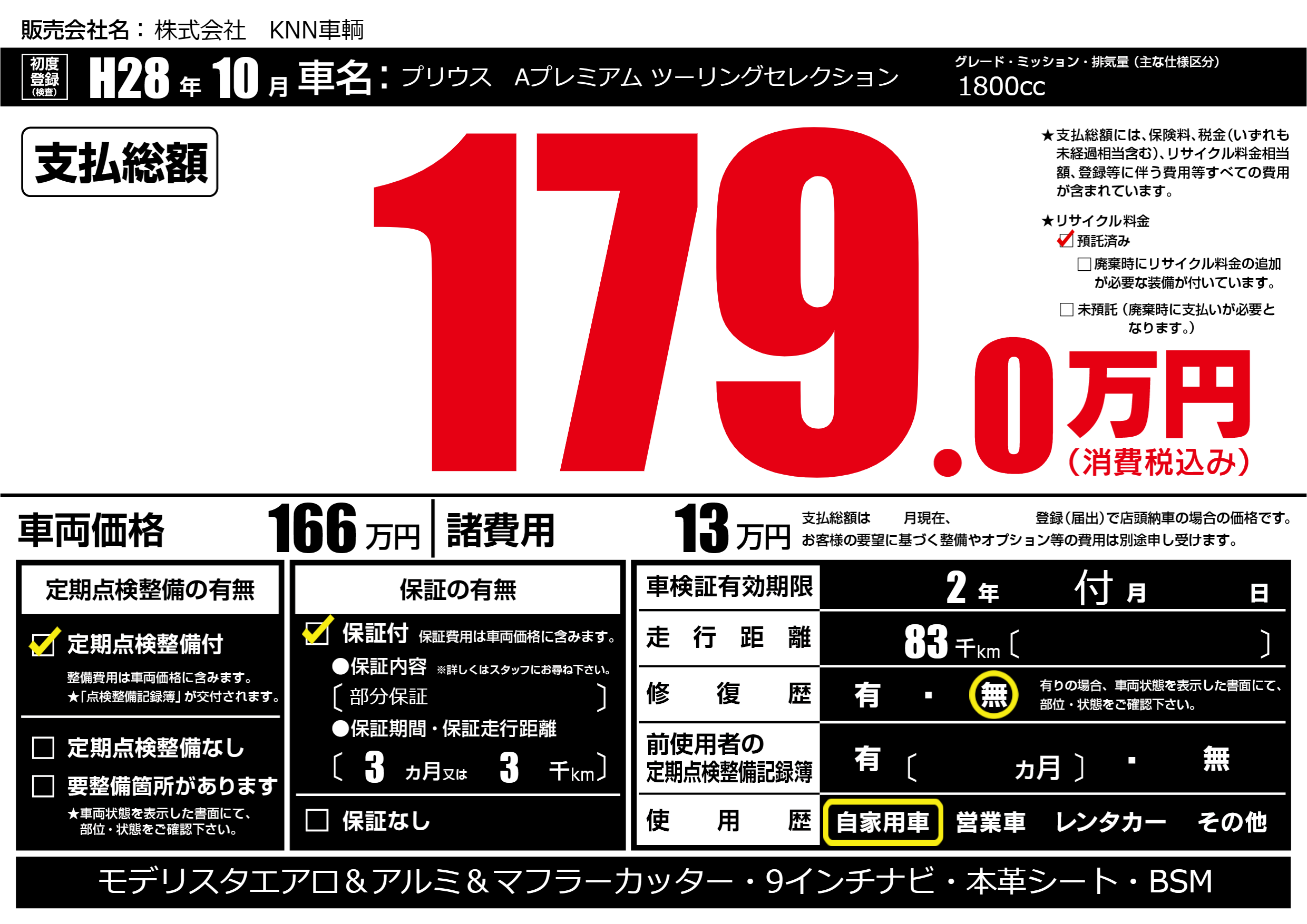 | 車名 | プリウス Aプレミアム ツーリングセレクション | グレード ミッション 排気量 |