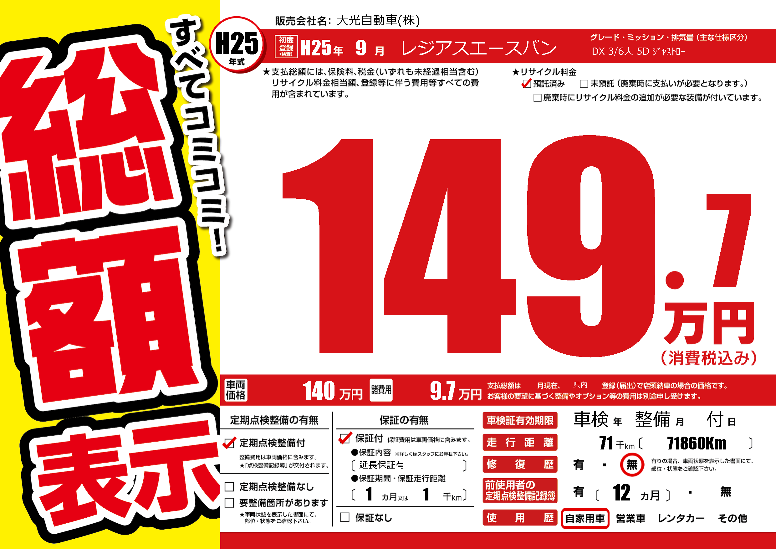 | 走行キロ | 7.1万km | 初年度登録 | H25年9月 |