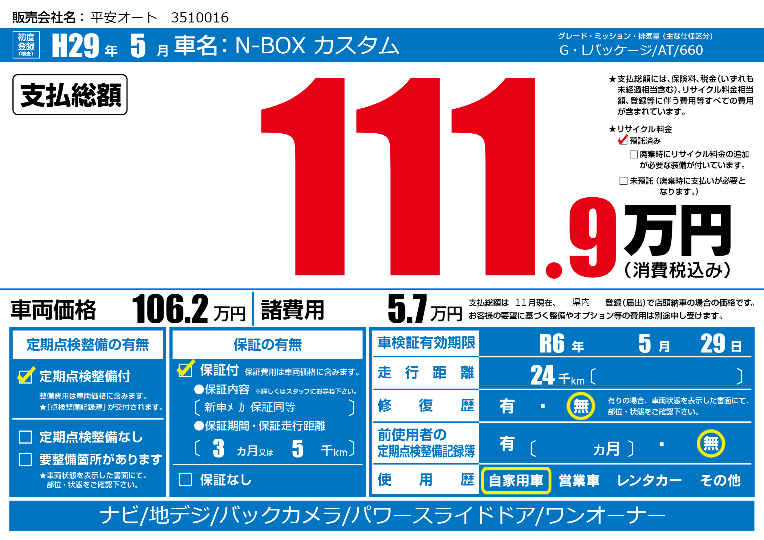 なし | 車検制限 | R6年5月29月 |